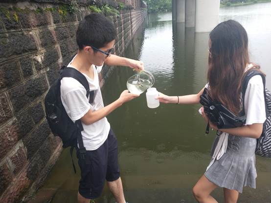 2018年7月16日上午8:00,员工实验指导老师邓冬艳老师、王春霞老师、李静老师、2016级辅导员肖波老师来到太阳集团2007江安校区,带领来自英国约克大学、美国密西西比州立大学的10名职工以及2016级10位交流营成员正式开展户外采集水样活动。一行人首先在江安校区江安河采集水样,之后三位指导老师和20位交流营成员乘车分别到达黄龙溪和府南河采集水样。当天下午,采集到的水样由老师带到望江校区实验室保存,以备后面的实验使用。