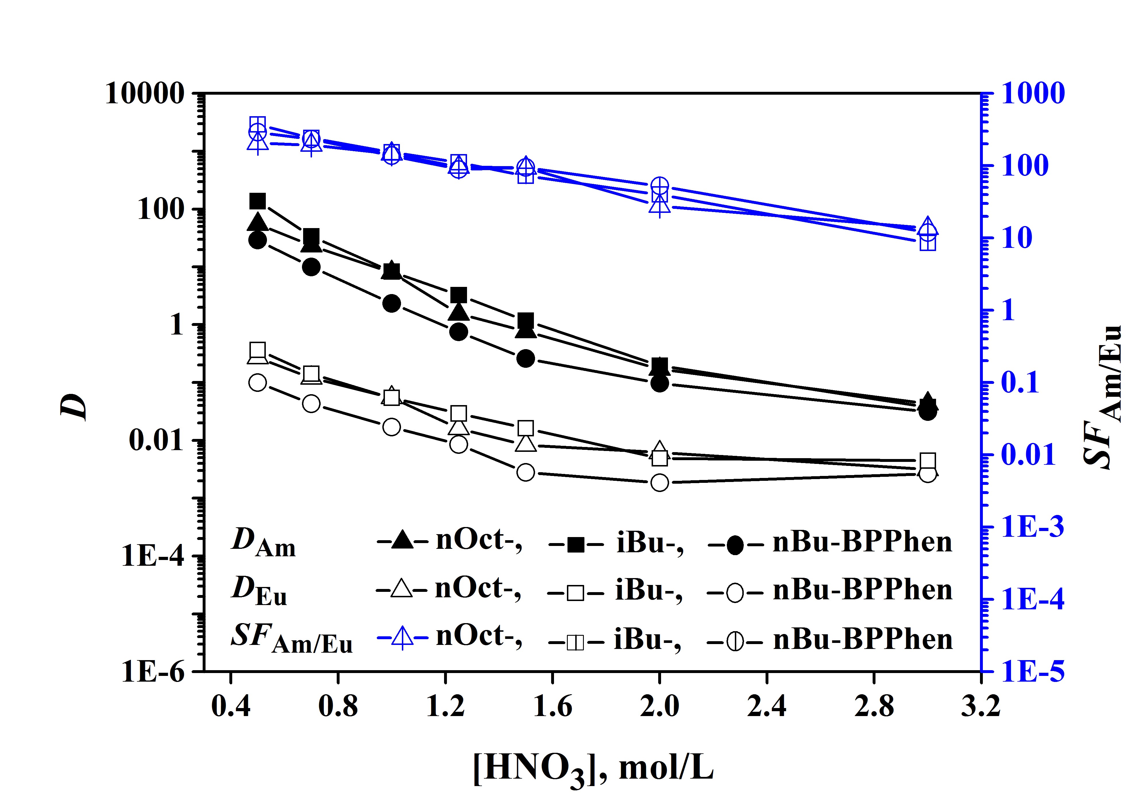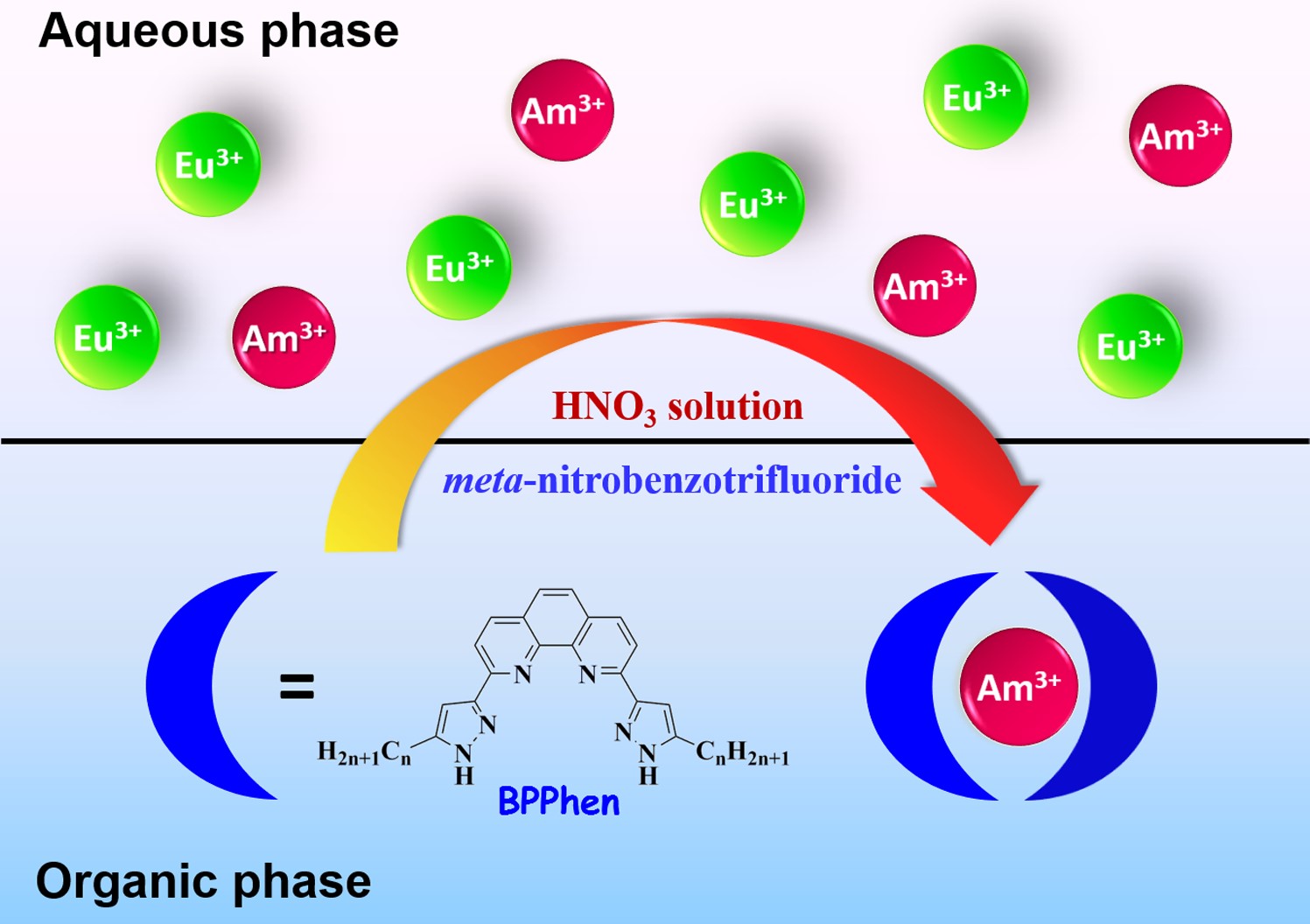 核工业高放废液处理中An3+与Ln3+的分离被公认为最具挑战性课题之一。迄今,尚未得到满意解决。目前,主要采用BTP、BTBP和BTPhen等三嗪吡啶类含N配体对An3+/Ln3+进行选择性萃取分离。尽管这类配体有较好的分离效果,但仍存在萃取动力学缓慢、不易反萃、酸稳定性差等缺点,尚不能满足实际需要。因此,研发新型高效的含N配体具有十分重要的意义!本工作首次合成了一类具有预组织性的邻二氮菲双吡唑配体(BPPhen)。萃取研究结果表明,BPPhen类配体可实现Am3+与Eu3+的高选择性分离;有快的萃取动力学(15 min即可达到萃取平衡);3.0 mol/L HNO3能定量反萃Am3+和Eu3+。同时,它们还具有十分优异的抗酸稳定性,与10 mol/L HNO3接触1个月,配体未发生降解。BPPhen克服了三嗪吡啶类配体存在的缺点,展示了良好的工业应用前景。