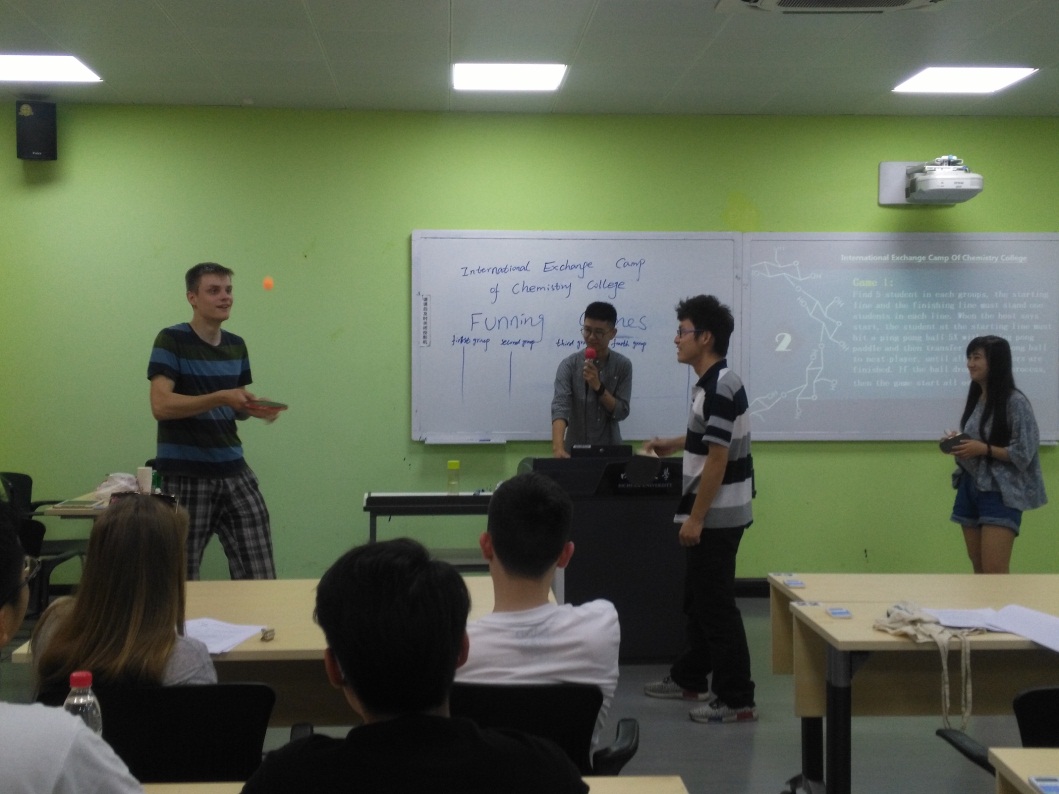 首先,主持人讲解了游戏规则。接着,开始进行各项游戏。本次活动的趣味竞技游戏有:乒乓球传运、做实验、手口不一、你哼我猜。整个趣味竞技游戏过程热烈而有序,活动展现了同学们的肢体协调能力、团结合作能力、专业技能、应变技能与艺术细胞,也更加促进了外国同学们和中国同学们之间的交流和协作,增进了友谊。