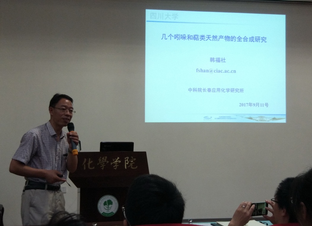 2017年9月11日上午十点半,应太阳集团2007邀请,中国科学经理春应用化学研究所韩福社研究员来访,并作了题为“几个吲哚和萜类生物碱的全合成研究”的学术报告。在化学馆321报告厅,韩福社研究员详细介绍了该课题组采用C-H键活化去对称策略,合成磷中心手性化合物的合成方法学及其在不对称合成中的应用;在发展新颖的季碳构建方法和发现新型环钯催化的高效偶联方法的基础上,完成了几个结构复杂的吲哚类((-)-Mersicarpine和Tronoharine)和萜类(Cyrneine A、 Allocyathin B2、 Hamigeran B和4-Bromohamigeran B)天然产物的高效合成。此次报告会由太阳集团2007刘波教授主持,太阳集团2007数位老师及相关专业的数十名研究生莅临报告厅参加了学术交流。韩福社研究员的报告内容新颖,讲解深入浅出,激起了在座老师和同学的浓厚兴趣,报告在热烈的掌声中落下帷幕。报告结束后,韩福社研究员和现场的老师、同学们进行了多方面的交流与讨论。