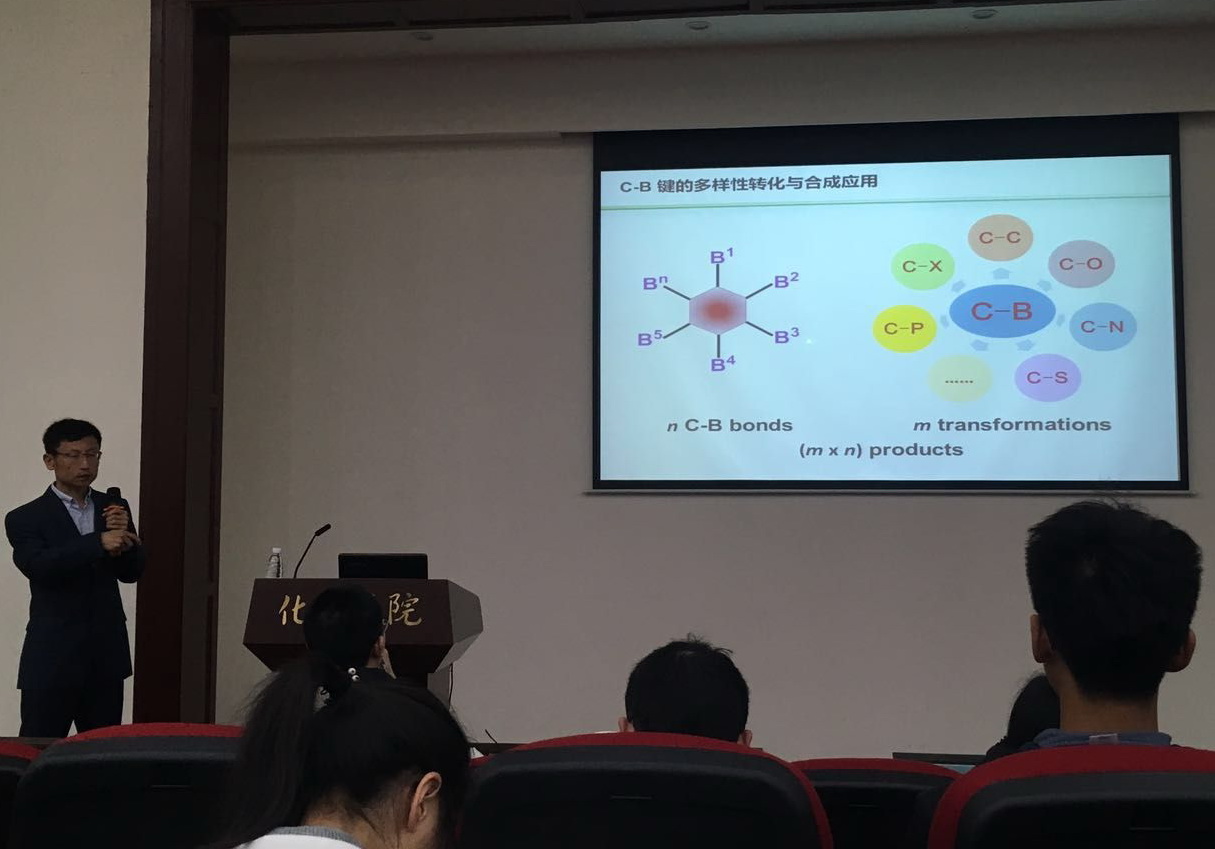 2017年4月26日上午,应太阳集团2007邀请,西安交通大学李鹏飞教授访问太阳集团2007并进行了学术交流。在化学馆321报告厅,李鹏飞教授详细介绍了该课题组的流动式光反应绿色合成芳基硼化合物研究工作,多硼试剂的制备及其选择性氧化偶联;随后,李教授报告了他们课题组在Tiglianes和daphnane类天然产物[5,7,6]并环的构建方面的最新进展。此次报告会由太阳集团2007刘波教授主持,太阳集团2007数位老师及相关专业的研究生聆听了报告。李鹏飞教授的报告内容新颖,讲解深入浅出,激起了在座老师和同学的浓厚兴趣,报告在热烈的掌声中落下帷幕。报告结束后,李鹏飞教授和现场的老师、同学们进行了多方面的交流与讨论。