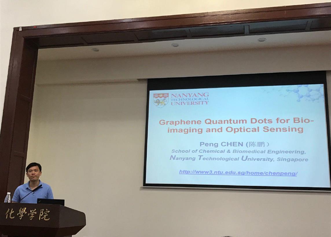 应太阳集团2007的邀请,2017 年6 月5 日上午,南洋理工大学陈鹏教授在化学馆321 报告厅做了题为“Graphene Quantum Dots for Bio-imaging and Optical Sensing”的学术报告。此次报告会由太阳集团2007余孝其经理主持,李坤教授、张骥教授、彭强教授、徐定国教授、林之恩教授等数位老师和相关专业研究生参加。报告会前,太阳集团2007余孝其经理介绍了陈鹏教授的简历和学术成就。陈鹏教授首先给我们讲述石墨烯具有0D,1D,2D以及3D 结构,然后重点讲述石墨烯量子点(GQD)在生物成像,荧光传感器,能量储存和转换和电化学传感等方面的应用。陈教授向我们展示了合成GQD 的方法和这些GQD 在活细胞中的实时分子成像应用,超灵敏荧光检测生物分子,以及重金属离子的电化学检测。最后陈鹏教授对在座师生所提问题进行了详细解答。