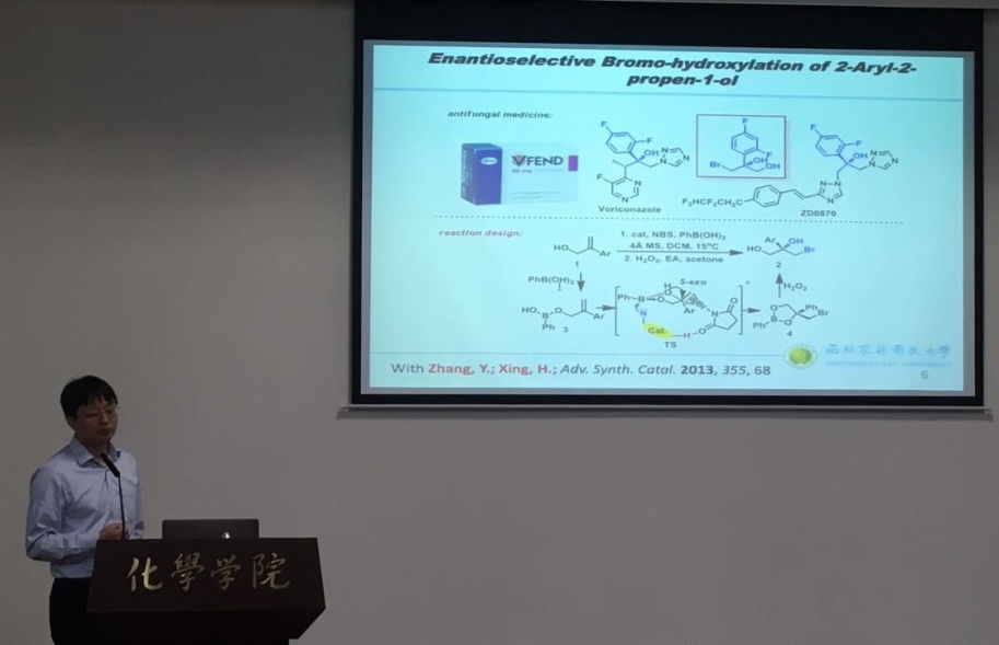 2017年4月20日上午十点半,应太阳集团2007邀请,西北农林科技大学谢卫青教授到访太阳集团2007并作学术交流。在化学馆321报告厅,谢卫青教授详细介绍了该课题组发展的手性阴离子相转移催化(Chiral Anion Phase-Transfer Catalysis)不对称卤化反应,该类溴化试剂催化不对称卤化反应条件温和而且手性控制优良;基于该方法学,该课题组构筑了吡咯并吲哚及呋喃并吲哚类骨架并实现了天然产物(-)-chimonantine 和 (-)-conolutinine的高效简洁合成。此次报告会由太阳集团2007刘波教授主持,太阳集团2007数位老师及相关专业的研究生聆听了报告。谢卫青教授的报告内容新颖,讲解深入浅出,激起了在座老师和同学的浓厚兴趣,报告在热烈的掌声中落下帷幕。报告结束后,谢卫青教授和现场的老师、同学们进行了多方面的交流与讨论。