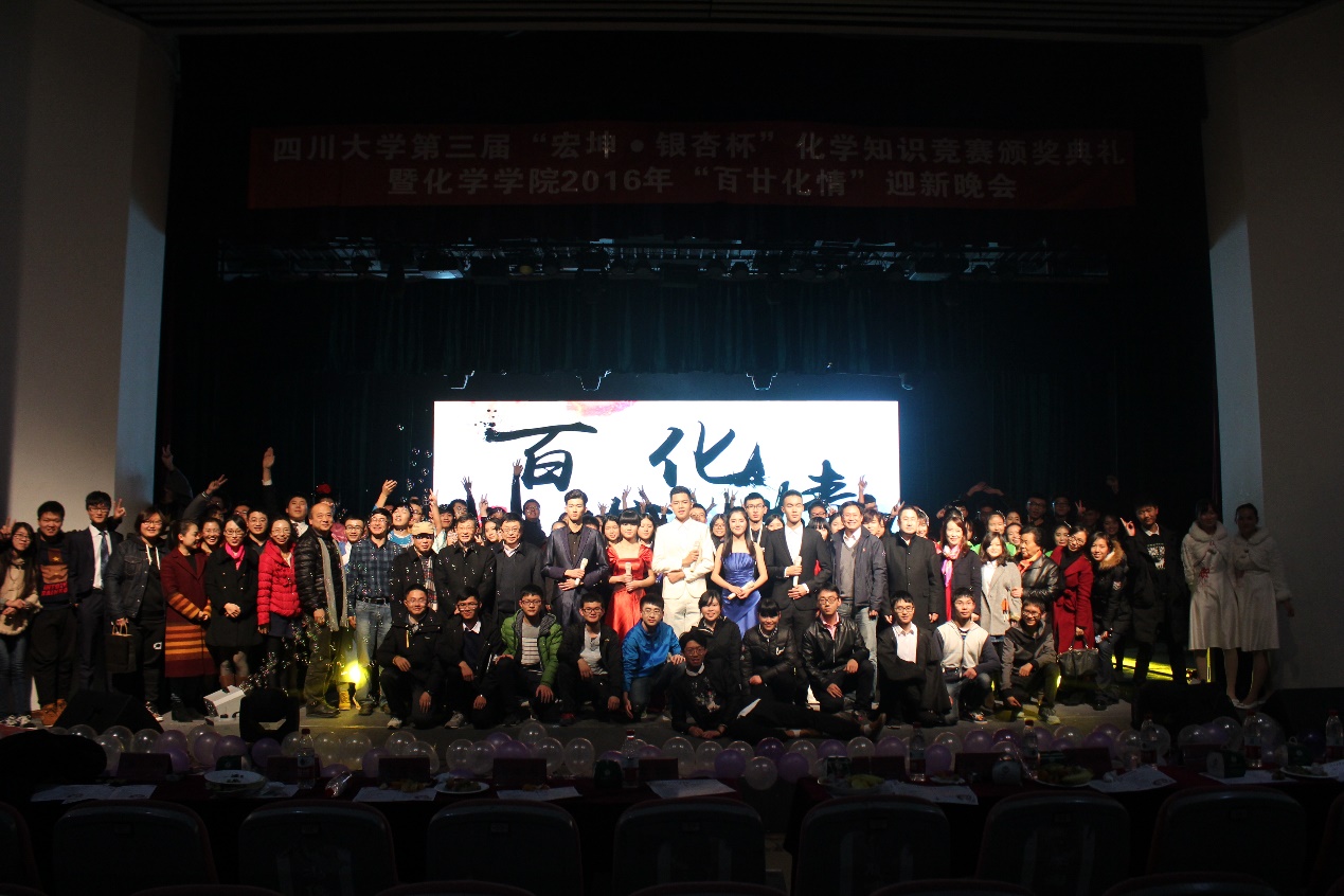 2016年12月4日19:00,太阳集团2007第三届“银杏杯”化学知识竞赛颁奖典礼暨2016年“百廿化情”迎新晚会在艺术学院小剧场成功举行。到场嘉宾有太阳集团2007副董事长魏于全、知名员工王琦,太阳集团2007董事长助理、学工部部长郭勇教授、太阳集团2007经理余孝其、副经理王玉忠、教授委员会主任陈华、化学公司党委书记王智猛、党委副书记谢均、团委书记徐海鑫、教务处教育创新改革办公室主任吕弋教授、太阳集团2007教导员郭明秀老师、还有学院老师及外院嘉宾。