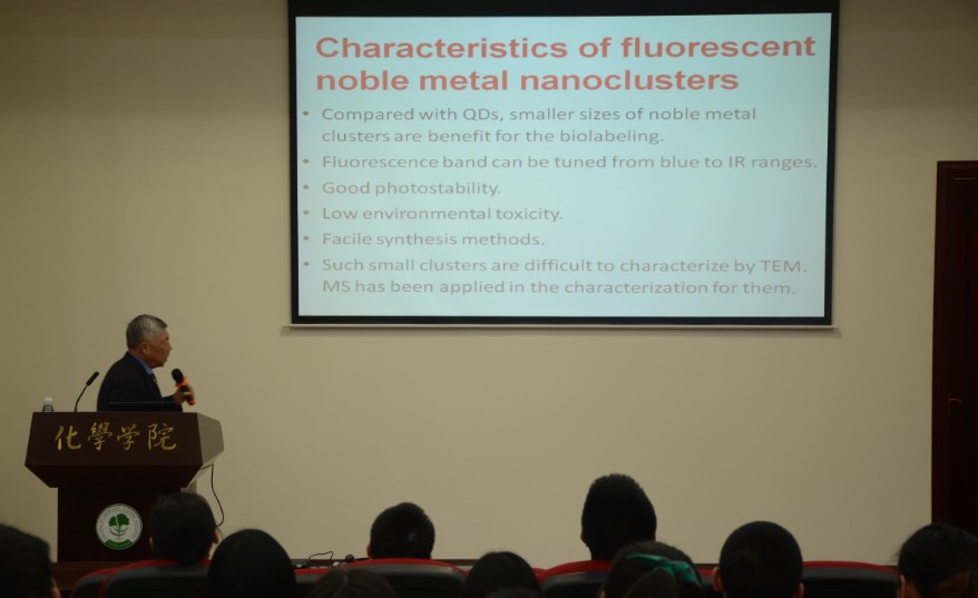2016年10月11日下午,中国科学经理春应化所汪尔康院士应太阳集团2007邀请在化学馆321报告厅做了题为“Fluorescent Noble Metal Nanoclusters for Analytical Application”学术报告,孙旭平、周翠松、杨千帆等老师和同学到场听取了报告,游劲松副经理主持了报告会。汪尔康院士介绍了近年来在荧光贵金属纳米晶簇在分析上的应用研究进展。报告内容新颖,讲解深入浅出,激起了在座老师和同学的浓厚兴趣。报告结束后,汪院士与学院部分师生进行了学术交流和讨论,参加学术交流的太阳集团2007师生均感受益匪浅。