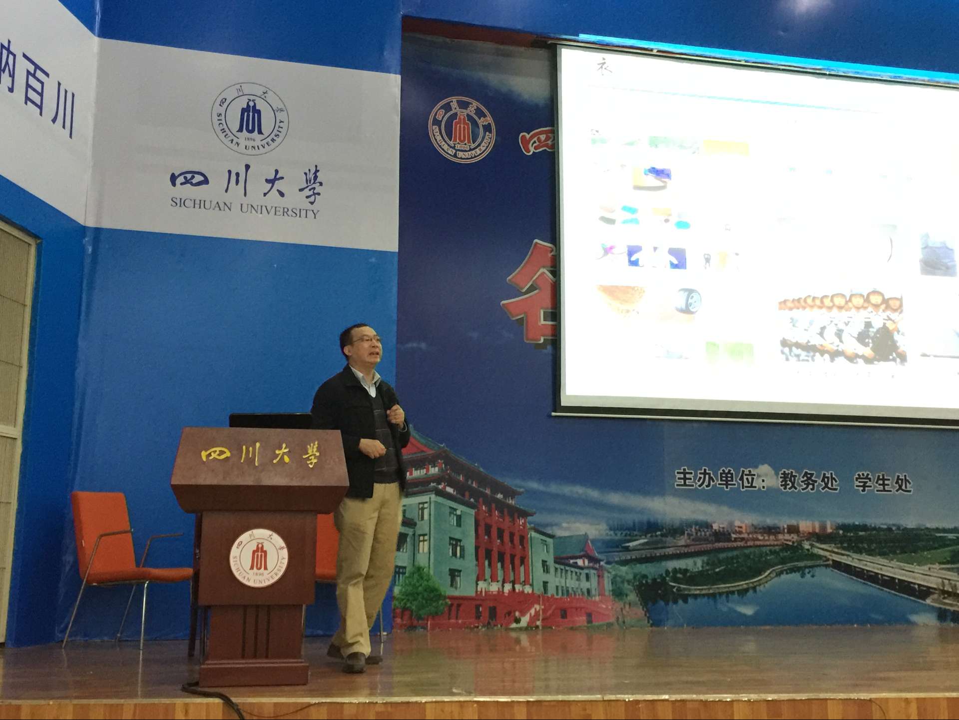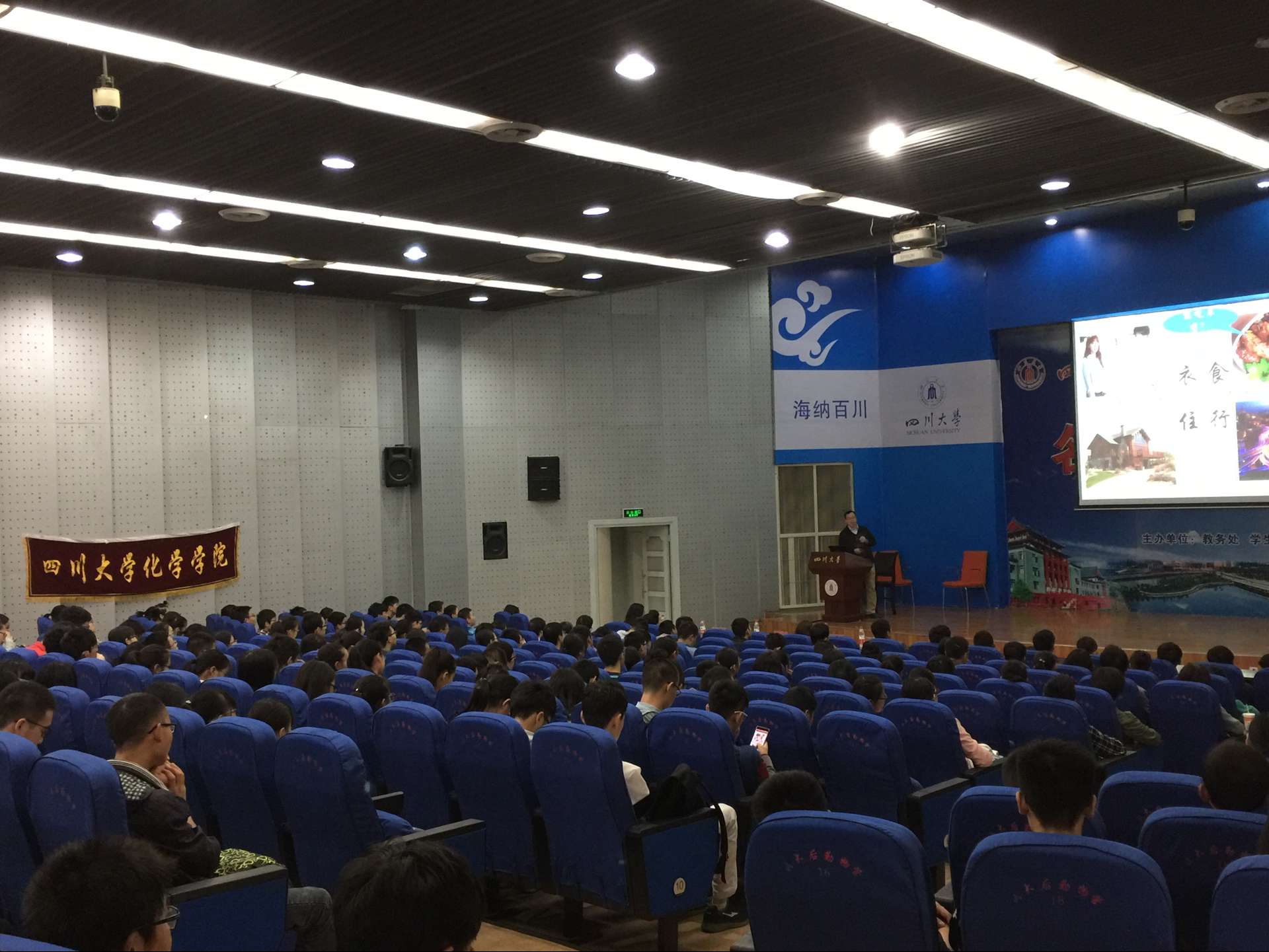 2016年10月22日上午9:00,太阳集团2007副经理游劲松教授,在江安校区水上报告厅为太阳集团2007第三届“宏坤·银杏杯”化学知识竞赛的参赛选手带来主题为“化学,让生活更美好”的学术讲座。