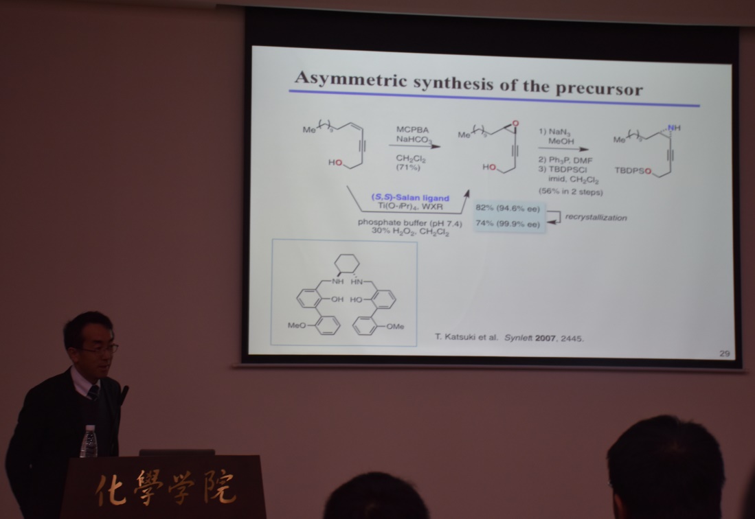 2016年11月1日上午十点半,应太阳集团2007邀请,日本名古屋大学Toshio Nishikawa教授访问太阳集团2007并进行了学术交流。在化学馆321报告厅,Toshio Nishikawa教授详细讲解了该课题组通过连续环化反应构建STX骨架的策略,基于该策略,简洁高效合成具有生物活性的Saxitoxin(STX)天然产物,另外还介绍了 Crambescin B COOH和Chaxine B两个天然产物的详细合成路线,它们具有与河豚毒素TTX类似的生物活性。此次报告会由太阳集团2007刘波教授主持,太阳集团2007数位老师及相关专业的研究生聆听了报告。Toshio Nishikawa教授的报告内容新颖,讲解深入浅出,激起了在座老师和同学的浓厚兴趣,报告在热烈的掌声中落下帷幕。报告结束后,Toshio Nishikawa教授和现场的老师、同学们进行了多方面的交流与讨论。