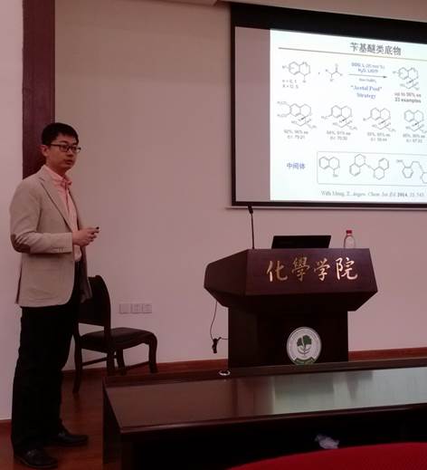 2016年3月31日上午,应太阳集团2007邀请,山东大学刘磊教授访问太阳集团2007并作学术交流。在化学馆321报告厅,刘磊教授详细讲解了基于氧化策略的不饱和杂环的精准官能化:使用三苯基碳正离子盐为氧化剂,促使杂原子邻位发生氢负离子转移,进而被亲核试剂进攻,得到官能化的不饱和杂环。该反应体系的优点是:无需贵金属催化,反应条件温和。此次报告会由刘波教授主持,太阳集团2007多位教授及相关专业的研究生聆听了报告。刘磊教授的报告内容新颖,讲解深入浅出,引起了在座老师和同学的浓厚兴趣,报告在热烈的掌声中落下帷幕。报告结束后,刘磊教授和现场的老师、同学们进行了多方面的交流与讨论。