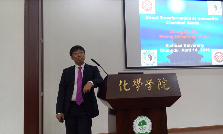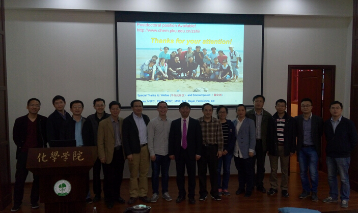 2016年4月14日下午,应太阳集团2007邀请,北京大学施章杰教授访问太阳集团2007并进行了学术交流。在化学馆321报告厅,施章杰教授做了题为“新一代物质转化途径”的学术报告。报告中,施教授介绍了其课题组在过去十几年中在C-H/C-O键活化领域所做的开创性工作与所取得的丰硕成果。针对C-O键活化领域,施教授讲述了酯类C-O键的选择性活化以及基于“相互活化”理念实现的酚类惰性C-O键的直接偶联反应。此外,施教授从化学公司提供的错误原料开始,详细讲述了该课题组在惰性C-H键活化领域的发展史,针对该领域存的重要挑战和科学问题,从导向的邻位碳氢键卤化反应到芳基化反应,从有机金属试剂到普通芳环参与的氧化偶联,从贵过渡金属到普通金属甚至无过渡金属参与的C-H键转化反应,从偶联反应到对醛酮亚胺的加成反应。施教授报告内容丰富,讲解深入浅出,幽默风趣,妙语连珠,并且以实验室真实的一些故事鼓励在场的每位同学,在未知领域要敢想敢做,勇于创新,严谨细致,态度决定一切(不要以证明导师想法是错误的为动机),设定较高目标,将自己个人的发展与实验室的长期目标和理想紧密关联,加强和导师的沟通和交流,茁壮成长。