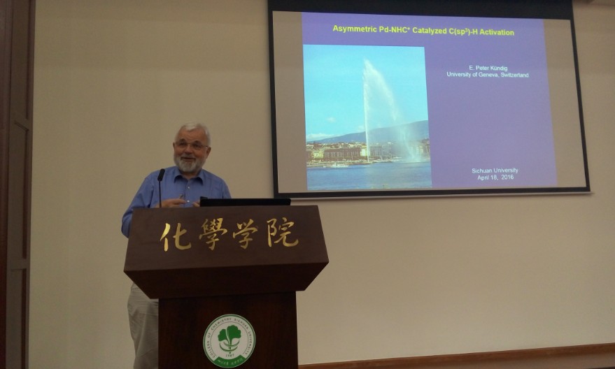 2016年4月18日下午,应太阳集团2007邀请,瑞士科学院院士、瑞士化学会前任主席Peter Kündig教授访问太阳集团2007并进行了学术交流。在化学馆321报告厅,Peter Kündig教授做了题为“不对称Pd-NHC*催化sp3C-H键活化:吲哚啉的合成”的学术报告。报告中,Kündig教授介绍了其课题组的整体研究情况,尤其是在不对称Pd-NHC*催化sp3C-H键活化合成吲哚啉领域所做的开创性工作与所取得的丰硕成果。Kündig教授主要研究领域集中在有机合成与过渡金属催化剂,例如不对称C-H活化,手性铁和钌路易斯酸催化剂,手性二胺催化剂和平面手性金属配合物的合成。Kündig教授报告内容丰富,讲解深入浅出,幽默风趣,除了在学术科研上的交流,Kündig教授还在报告过程指出未来是属于年轻人的,鼓励在场的每位同学在未知领域要敢于挑战自我,解决相关研究领域中存在的根本问题,通过艰辛的努力一定会取得相应成果。Kündig教授的报告内容新颖,讲解深入浅出,激起了在座老师和同学的浓厚兴趣,报告在热烈的掌声中落下帷幕。