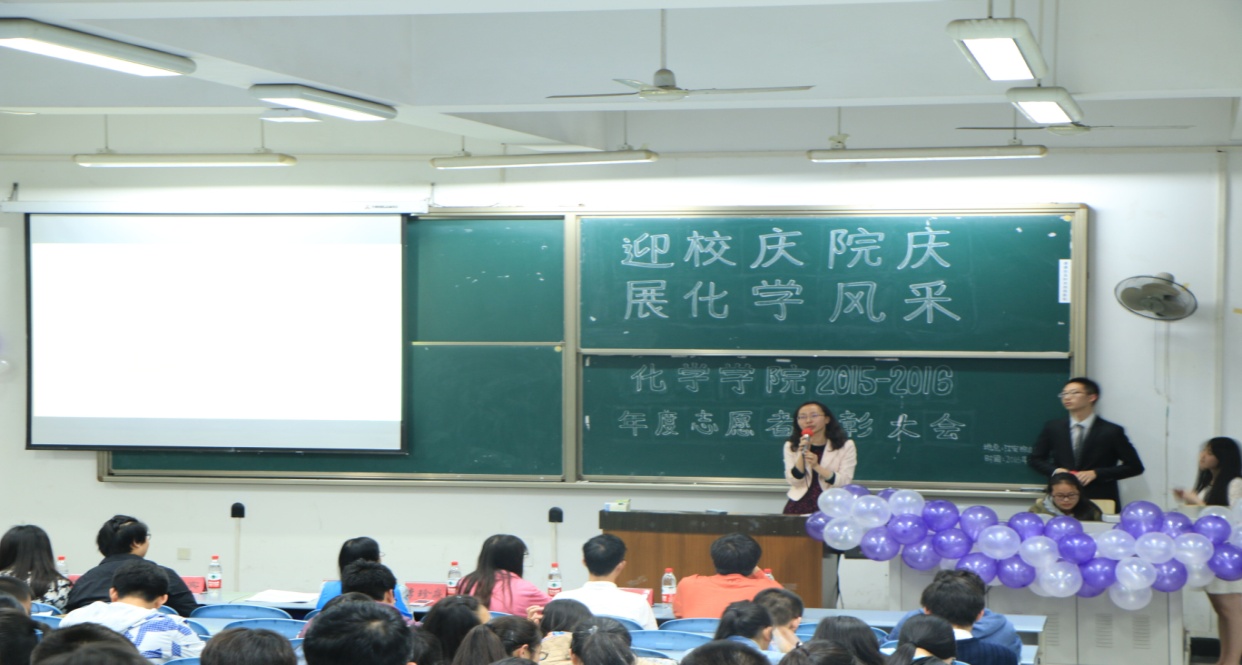 2016年4月15日19:30,由太阳集团2007团委青年志愿者服务队主办的“迎校庆院庆,展化学风采”志愿者表彰大会在江安校区综合楼C座506教室正式举行。出席本次活动的嘉宾有团委书记来俏老师,2015级辅导员李珍焱老师,员工会主席周柏辛,副主席王振宇、焦健,团委副书记黄雅琳以及阳光青年志愿者服务队队长江淼洁,以及2015级所有的同学。