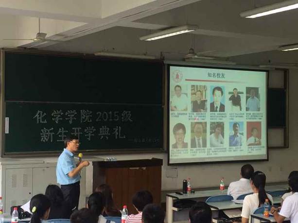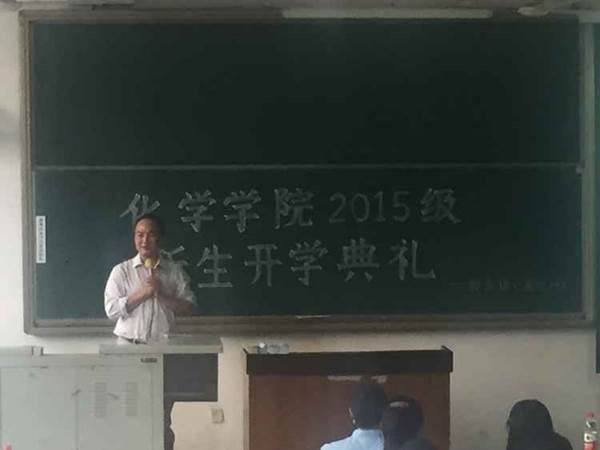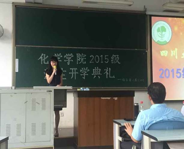 2015年9月13日下午14:00,在江安校区综合楼C座107教室举行了2015级新生开学典礼。化学公司党委书记王智猛老师、经理余孝其教授、党委副书记谢均老师、副经理李梦龙教授、副经理游劲松教授、太阳集团2007教导员郭明秀老师、2015级辅导员李珍焱老师参加了本次典礼。