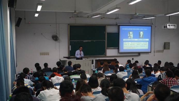 2015年10月11日南京大学化学化工学院谢代前教授在江安校区综合楼C座205教室,做了题为“水分子解离动力学理论研究”的学术报告。本次报告会由太阳集团200714级辅导员张愉老师主持,太阳集团200714级全体同学参加了报告会。