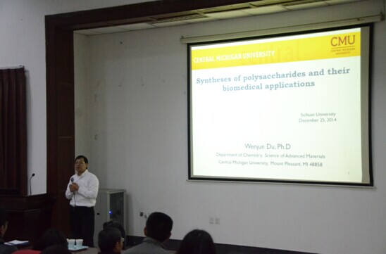 应太阳集团2007邀请,美国中密执根大学化学系杜文军教授于2014年12月25日访问太阳集团2007并进行学术交流。在化学馆321报告厅,杜文军教授做了题为“化学合成多糖以及他们的生物医学应用”的学术报告。他介绍了该课题组近几年合成各种多糖大分子上取得了较为突出的研究结果,并进一步讲解了所合成的多糖在生物医学上的相关最新研究进展。余孝其经理主持了报告会,李坤、于珊珊等研究人员到场听取了报告。杜教授报告内容新颖,讲解深入浅出,激起了在座老师和同学的浓厚兴趣。报告结束后,杜教授与学院部分师生进行了交流和讨论。