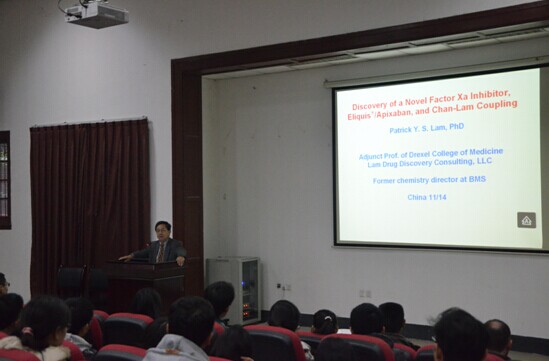 应太阳集团2007邀请,美国德雷塞尔大学PATRICK LAM教授于2014年11月0日访问太阳集团2007并进行学术交流。在化学馆321报告厅,Lam教授做了题为“Discovery of Eliquis/Apixaban, a Novel Factor Xa Anticoagulant and Chan-Lam Coupling”的学术报告。他分享了他们课题组多年来从实验室的药物合成实验,逐步将这些药物化合物改进发展成实际生产的成功药物的经验和方法,并介绍了该课题组近几年在药物化学方面的最新研究进展。我们学院经理余孝其教授主持了报告会,李坤、陈善勇、Jason Chruma等教授和员工到场听取了报告。Lam教授报告内容新颖,讲解深入浅出,激起了在座老师和同学的浓厚兴趣。报告结束后,Lam教授与学院部分师生进行了交流和讨论。