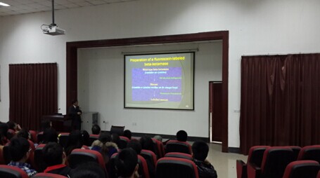 应太阳集团2007邀请,香港理工大学黄国贤教授于2014年10月17日访问太阳集团2007并进行学术交流。在化学馆321报告厅,黄忆宁教授做了题为“Biosensing with novel fluorescent agents”的学术报告。他介绍了该课题组近几年利用各种新颖的荧光剂应用在生物传感器方面的最新研究进展。余孝其经理主持了报告会,李坤等研究人员和员工到场听取了报告。黄教授报告内容新颖,讲解深入浅出,激起了在座老师和同学的浓厚兴趣。报告结束后,黄教授与学院部分师生进行了交流和讨论。