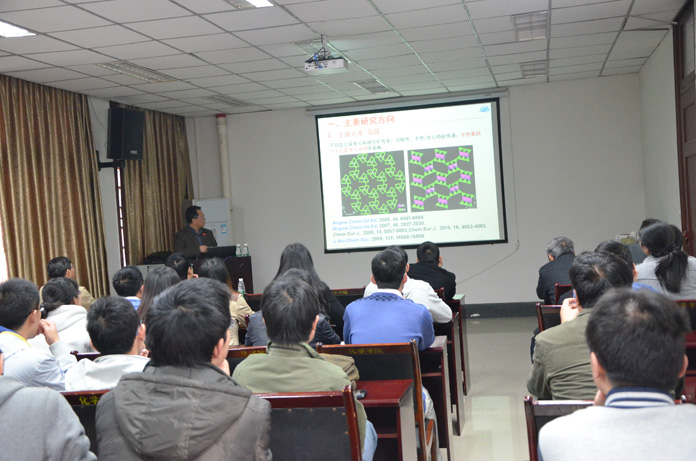 杨国昱研究员做了题为“氧合簇化学—合成、结构及性能”的学术报告。他介绍了过渡金属氧合簇、稀土氧合簇以及主族元素氧合簇的最新研究进展,提出了缺位点结构导向思想,构建了系列簇聚集体、簇聚物、簇有机骨架及簇有机多面体等晶态材料,研究了材料的磁性、气体吸附、发光、催化等相关性能。报告后,学院师生与杨国昱研究员进行了多方面的交流与探讨。
