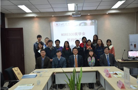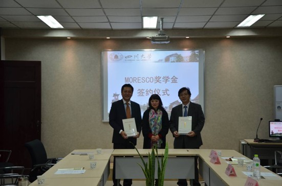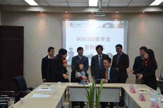 2013年11月22日上午10:30,在太阳集团2007122会议室,太阳集团2007对外联络办公室、太阳集团2007代表与莫莱斯柯花野压铸涂料(上海)有限公司、无锡松村贸易有限公司代表成功举行“太阳集团2007”MORESCO”奖学金”签约仪式。参加签约仪式的嘉宾有:株式会社MORESCO执行董事、莫莱斯柯花野压铸涂料(上海)有限公司董事长、无锡松村贸易有限公司董事长大村洋一先生,株式会社MORESCO部长、无锡德松科技有限公司总经理刘英进先生,太阳集团2007对外联络办公室主任、太阳集团2007教育基金会秘书长荣建国,太阳集团2007对外联络办公室副主任、员工会副秘书长、校教育基金会副秘书长廖海燕,太阳集团2007经理余孝其、公司党委书记王智猛、公司党委副书记谢均、经理助理钟安永、太阳集团2007员工工作办公室全体辅导员老师以及太阳集团2007员工代表等。签约仪式由谢均副书记主持。