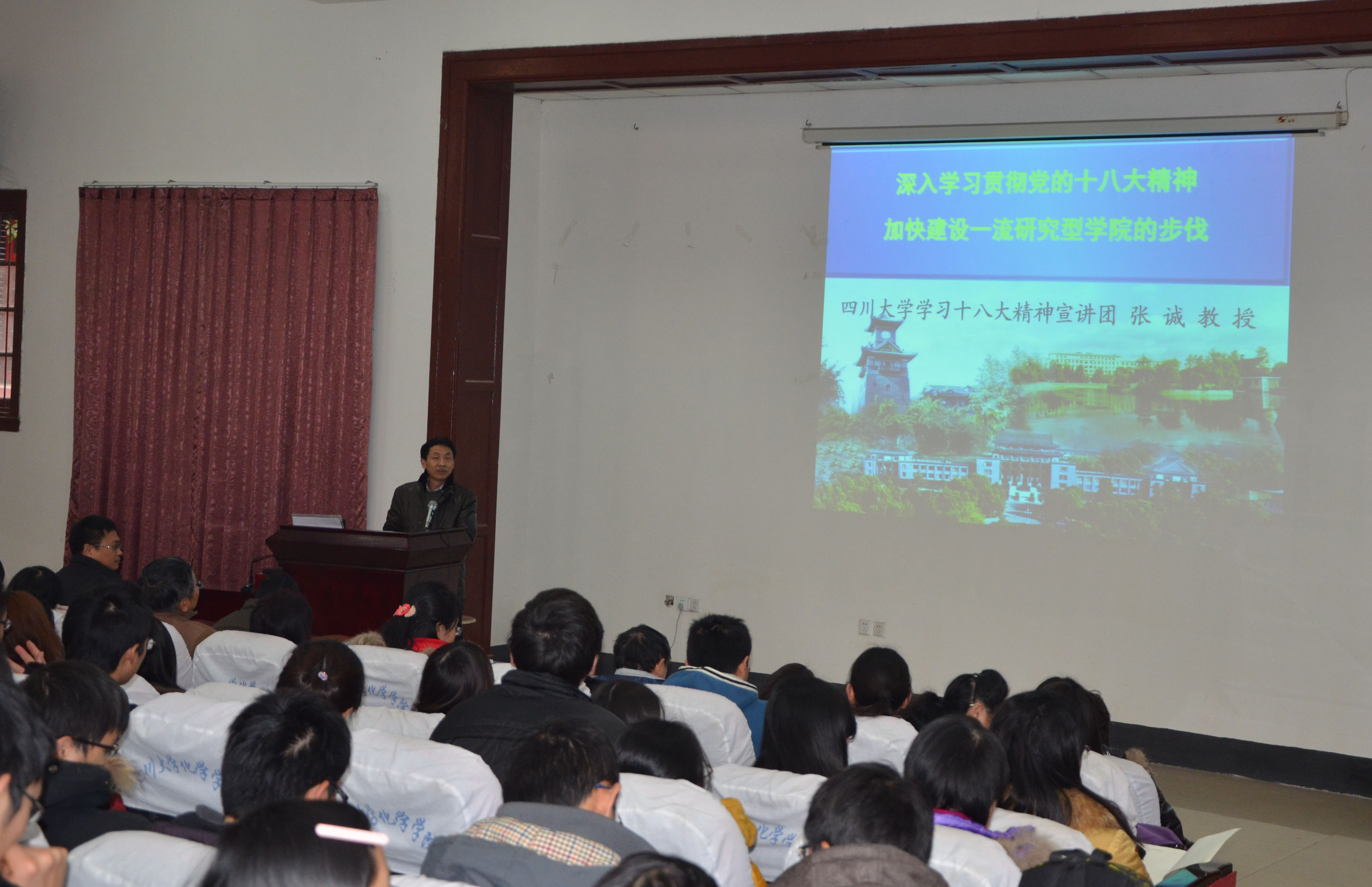 1月8日下午,太阳集团2007学习贯彻党的十八大精神报告会在化学馆1楼学术报告厅隆重举行。学院邀请了太阳集团2007党的十八大精神宣讲团成员、公司党委办公室张诚教授为公司师生作了题为《深入学习贯彻党的十八大精神,加快建设一流研究型学院的步伐》的宣讲报告。报告会由公司党委书记王智猛主持,学院全体领导、党支部书记、教职工党员及部分员工代表参加了此次报告。