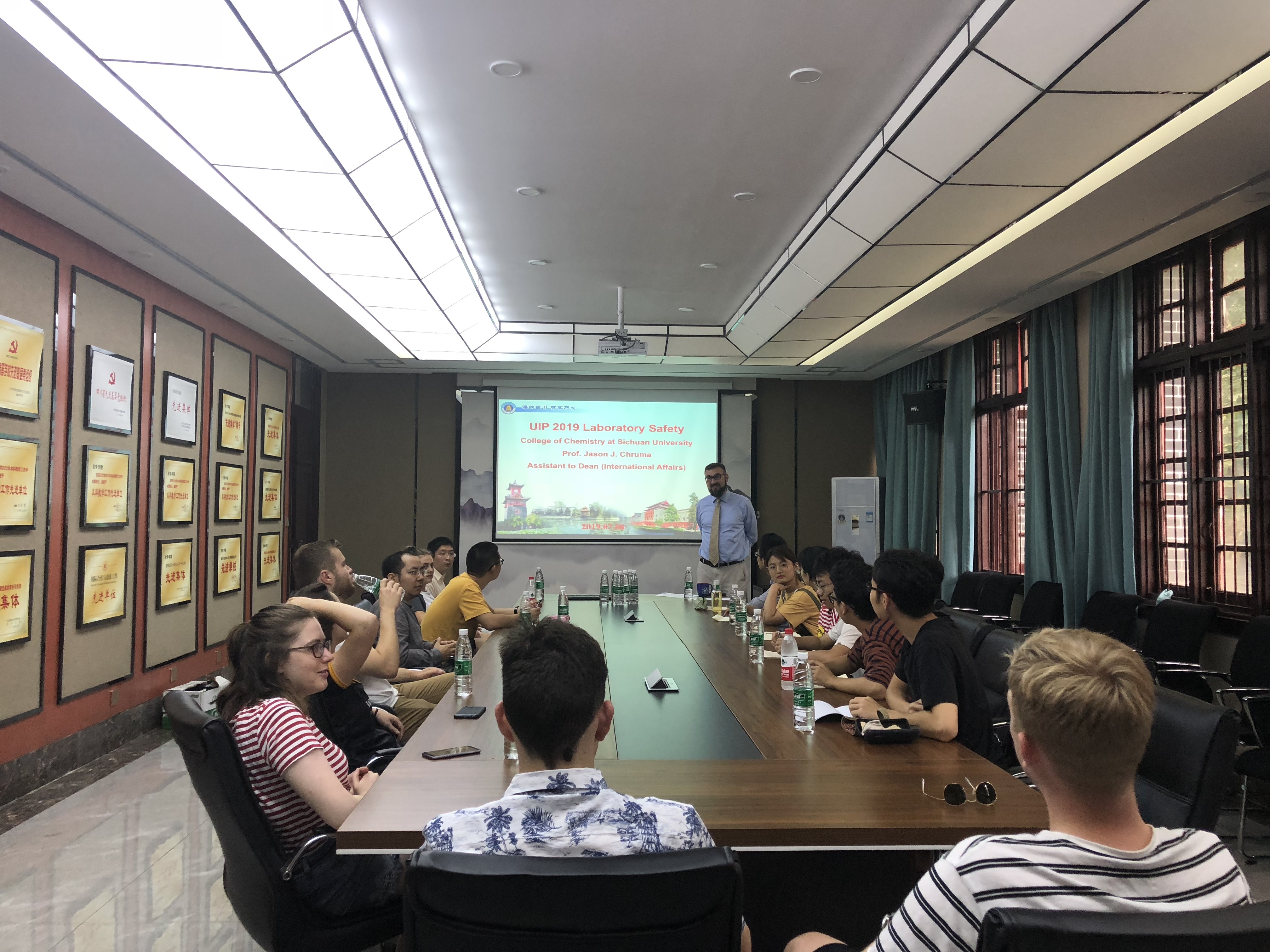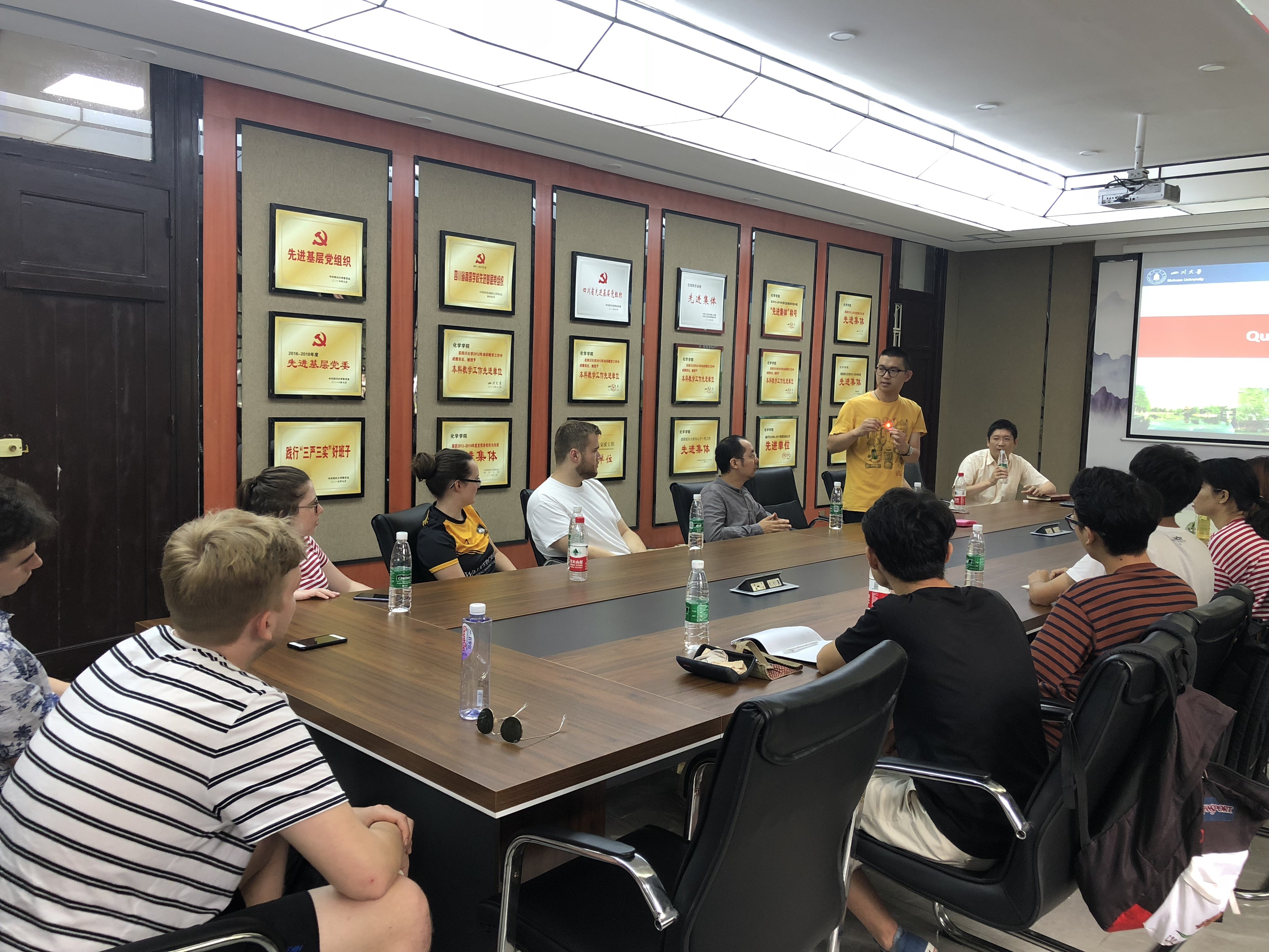 2019年7月8日早上10点,2019年国际交流营活动之一——化学实验室科研周拉开帷幕。来自英国约克大学的6名职工及太阳集团20076名2017级本科生将分为三组进入学院化学实验室开展为期一周的科研工作,在化学馆122与科研导师余志鹏教授、杨千帆副教授、宾正杨副教授见面。太阳集团2007全职外教Jason Chruma教授、外事秘书马晓爽老师参加见面会。