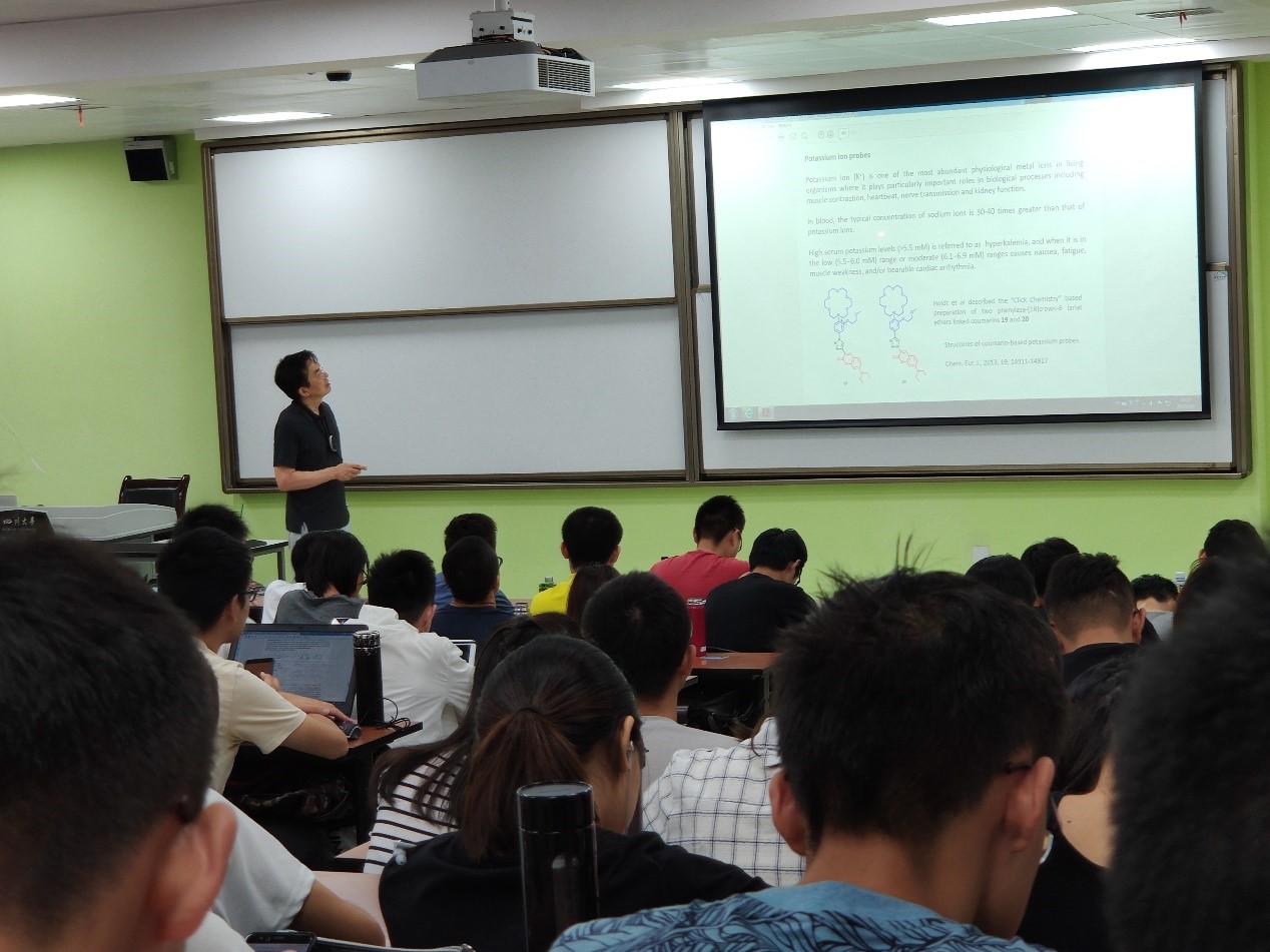 Yoon教授首先介绍了超分子化学的概念,讲述了超分子化学的发展历史,并科普了诸位获得诺贝尔奖的超分子化学家的生平,以及他们各自对超分子化学做出的贡献。接着,他为同学们讲解了现今发展比较成熟的各种超分子主体客体组装模型,以丰富的实例让同学们能更贴切的理解这些概念。随后,Yoon教授就自己在诺奖得主Donald J. Cram处的博士后经历,以及自己课题组的工作为例,详细的介绍通过荧光的手段使用超分子化学的理念实现阴离子与金属阳离子、生物体内活性硫醇的检测。最后,教授还为同学们着重介绍了光动力治疗(现阶段科研的热点之一)的原理,设计策略以及应用前景,让同学们更进一步的了解国际科技前沿。Yoon教授课堂中所使用的均为国际顶级期刊Nat. Chem., JACS, Angew等杂志中的典型案例,以一个阐述者的角度为同学们解读文献中的设计原理、应用策略以及各自的优劣,让同学们在听课的同时,能更深入的了解文献阅读时需要注意的批判性思维,让大家更直观的感受到化学学科的逻辑与严谨。