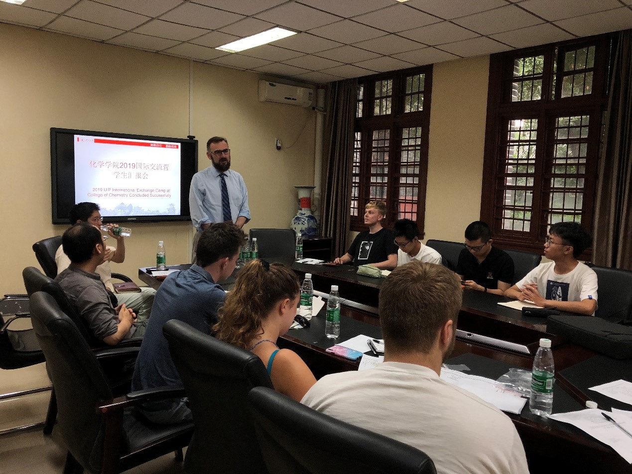 首先,Chruma教授对所有参会师生表示了欢迎,接着中外员工开始了汇报交流:宾正杨副教授指导的英国约克大学的Amy Clayton与Andrew Wrigley同学分享了在实验室制作OLED的理论依据和实验流程,并向大家展示了制作好的器件;接着,余志鹏教授指导的四名中外同学讲述了为期一周的有机及化生实验经历,特别指出余教授课题组先进的仪器大幅提升了实验效率;最后,杨千帆副教授指导的四名中外员工分别与大家分享了这一周所做的生物分析化学相关实验。在三组交流营成员完成科研汇报交流后,Chruma教授鼓励各位同学就本次交流营活动畅所欲言。中外员工均认为这是 一次难忘的经历,他们通过此次交流营不仅收获了化学知识、掌握了化学实验操作技能,还收获了友谊。英国员工对学院组织本次交流营活动及中国员工的日常帮助表示感谢。