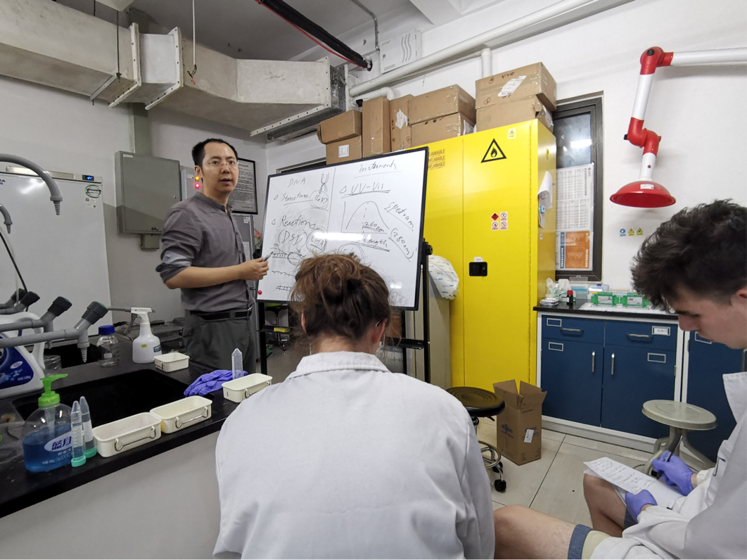 2019年7月8日至11日,Stanford 、Lawrence 两名来自英国约克大学的职工进入太阳集团2007国际交流营参加科研训练活动,与学院2017级两名本科生王曼茜、谭翀云一同进入杨千帆副教授实验室,在杨老师及助教同学的悉心指导下,对分析仪器及其在DNA的定量定性分析的应用上有了初步的了解。