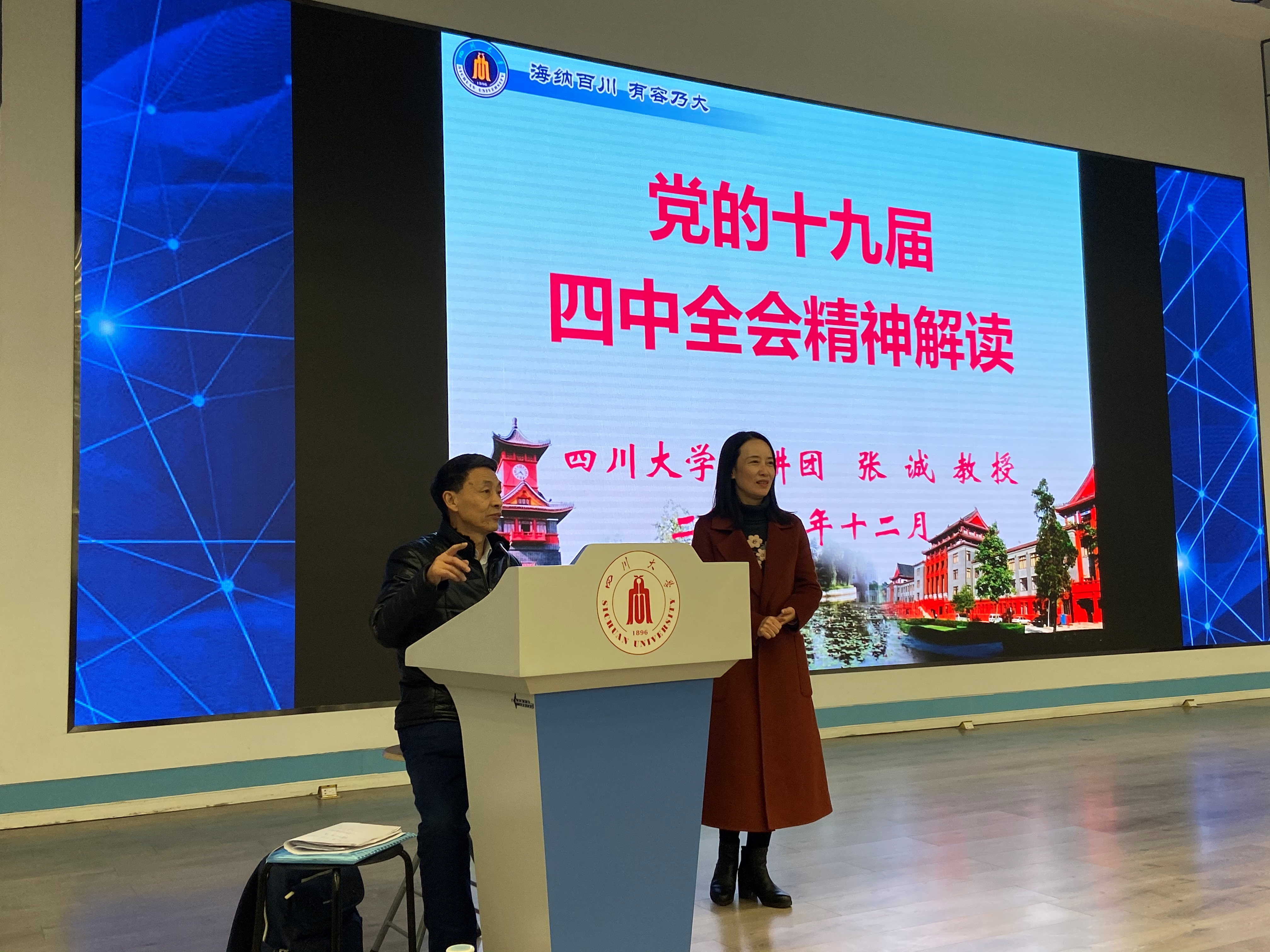 2019年12月20日下午,太阳集团2007在望江校区东三教演播厅举行“党的十九届四中全会精神宣讲报告会”,特邀学校宣讲团专家张诚教授主讲。报告会由公司党委副书记谢均同志主持,学院领导班子成员和师生职工党员300余人参加了宣讲报告会。