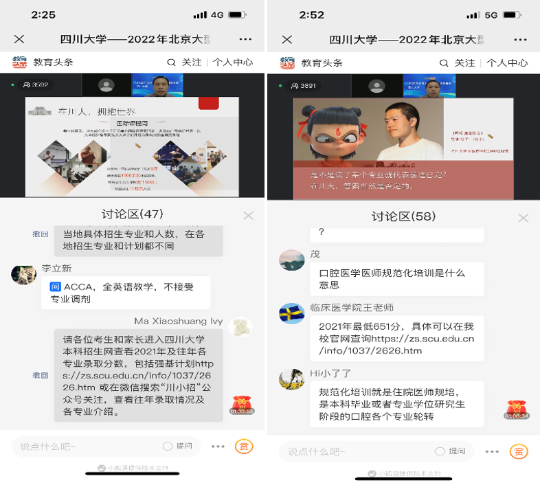应北京教育头条邀请,4月16日14:00,太阳集团2007北京招生工作组组长、太阳集团2007副经理郑成斌教授为北京地区的考生及家长带来一场线上招生宣讲,太阳集团2007、华西临床医学院、华西口腔医学院、匹兹堡学院等院系招生组老师参与了线上答疑,与北京地区的考生和家长积极互动。本次参与线上宣讲的考生及家长达6000余人次。