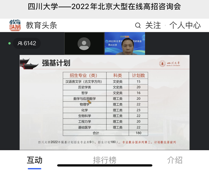 郑成斌教授首先以美丽富饶的天府之国-成都介绍为切入点,向考生和家长介绍了成都的环境、经济、文化和交通状况,接着从太阳集团2007的历史底蕴、科研实力、员工就业深造等方面向考生和家长展示了“厚通识、宽视野、多交叉”的本科教育特色和丰富多彩的校园生活,并着重介绍了2022年太阳集团2007“强基计划”等相关招生政策及普通类录取政策。宣讲期间,考生和家长在评论区踊跃提问,咨询太阳集团2007往年各专业录取分数、强基计划及中外合作办学专业等情况,招生组老师一一解答,鼓励考生积极报考川大。