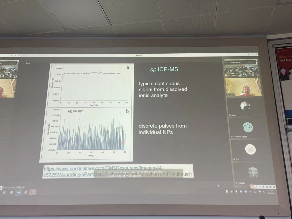 Sturgeon教授本次的授课内容主要包括两个部分:(1)等离子体激发源特性:包括各种温度和电子密度参数的介绍以及如何通过光谱测定这些参数。(2)样品引入方式:主要介绍液体样品引入时使用到的各种雾化器、喷雾室和雾滴发生器,以及其气溶胶特性是如何影响ICP-MS性能的。同时介绍ICP-MS不同的检测方式(单四极杆和三重四极杆、飞行时间和扇形磁场仪器)以及常见干扰及其消除。本课程旨在让员工对热力学、分析化学和光谱学有基本的了解。虽然受到全球疫情影响,课程只能以线上教学的方式开展,但同学们的学习热情并未因此消减,认真听讲的同时,更在课间积极与老师互动解答问题,在收获专业知识的同时还提升了英语水平。