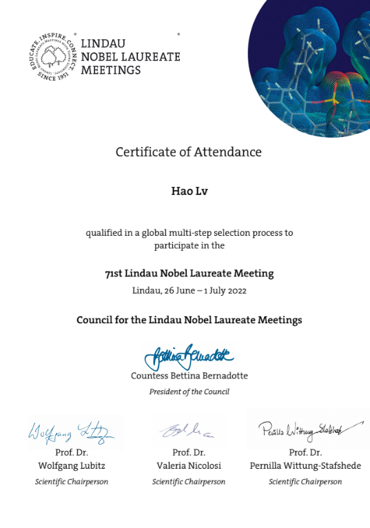 第71届诺贝尔奖获得者大会于2022年6月在德国林岛举办,本届会议主题是化学,尤其聚焦在催化与合成和有机催化方面。公司2020级博士研究生吕浩通过层层选拔,从全国众多知名高校的158名优秀博士生和青年学者候选人中脱颖而出,作为国内最终获得参会资格的30名博士生之一,与30位诺奖得主和来自90个不同国家地区近500位优秀的青年学者们共赴学术盛宴,探讨化学领域科研最新进展。