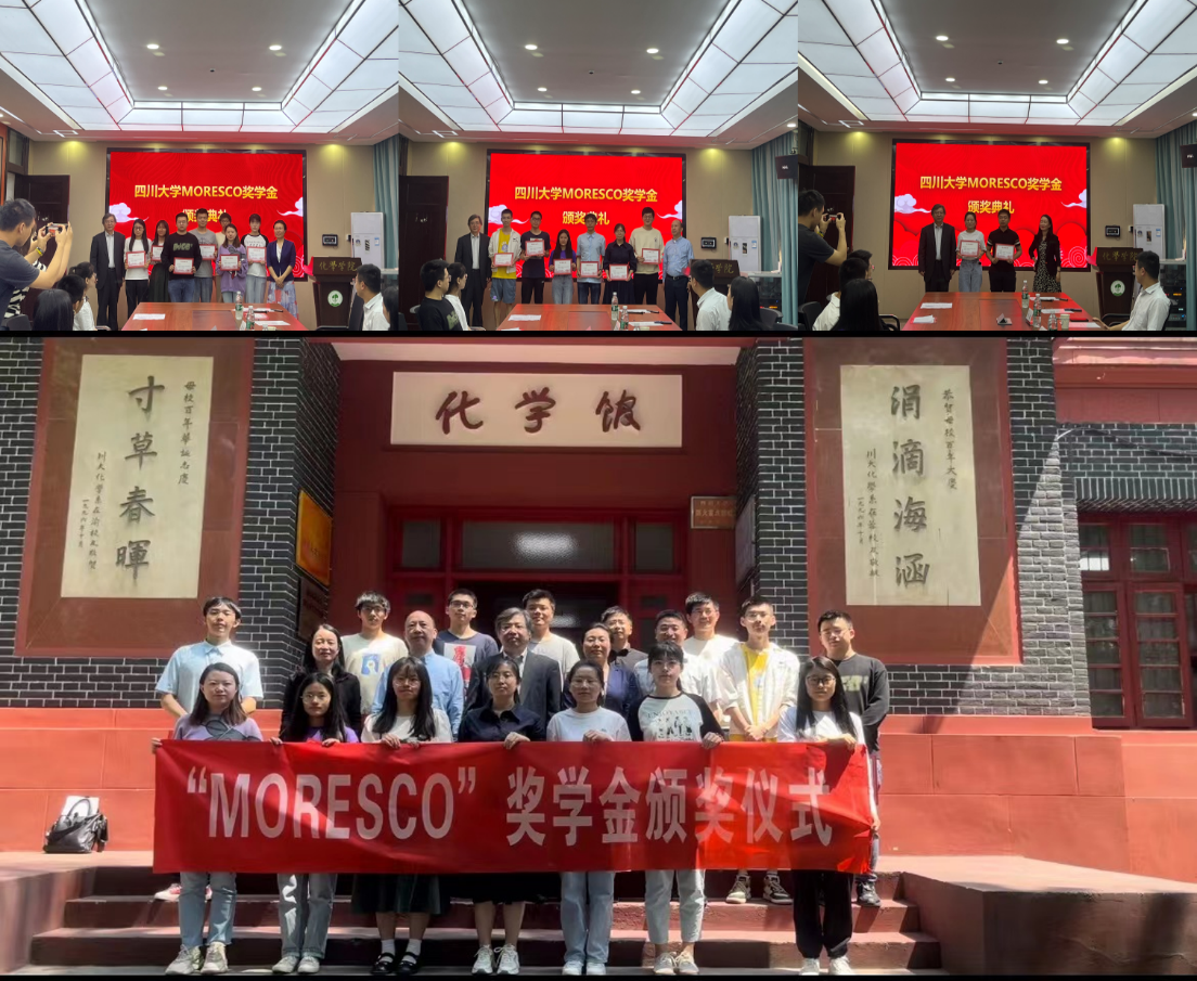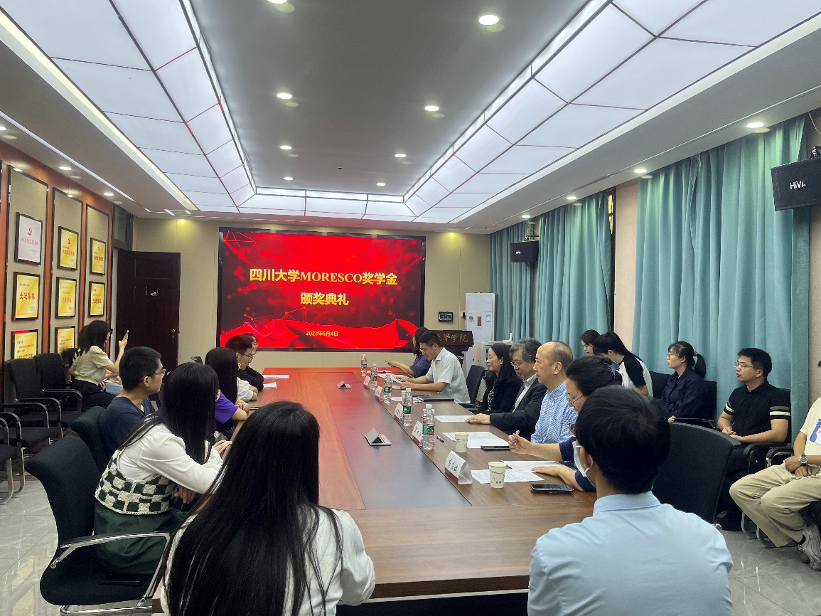 5月4日上午,太阳集团2007“MORESCO奖学金”颁奖典礼在化学馆122会议室举行。日本MORESCO执行役员、中国区总负责人、莫莱斯柯贸易(浙江)有限公司董事长、莫莱斯柯(浙江)功能材料有限公司董事长、德松科技有限公司董事兼总经理 刘英进先生,成都方夏智能科技有限公司董事长夏初俄先生,太阳集团2007教育基金会副秘书长贾秀娥老师,化学公司党委书记谢均、副书记肖波,辅导员及获奖同学参加了此次颁奖。颁奖仪式由肖波老师主持。