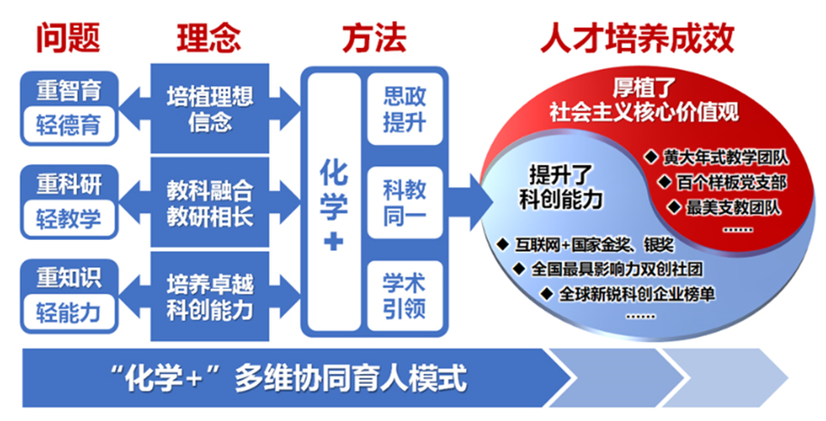 该成果创建了“化学+”多维协同育人模式:通过“化学+思政提升”育人模式,采取在科研团队或学科方向建立师生混合党支部、国家级人才任支部书记等措施,厚植员工社会主义核心价值观;通过“化学+教科同一”模式,实施院士等高层次人才主讲本科课程等“五进课堂”措施,推进教学科研团队融合同一,克服“重科研轻教学”的不足;通过“化学+学术引领”育人范式,为员工配备高水平学业导师,开放科研资源,引导员工开展多层次科研训练,提升科创兴趣和能力。