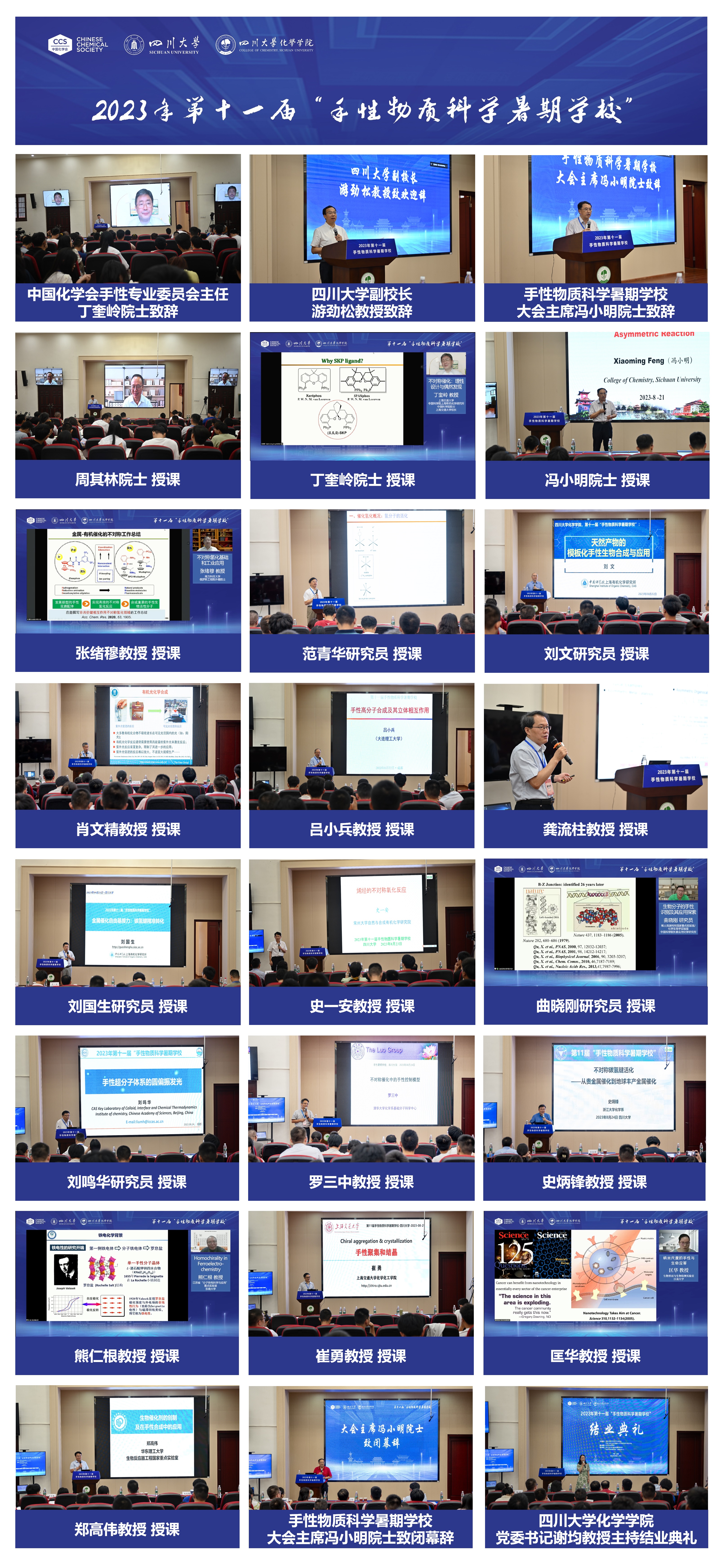在为期5天的暑期学校期间,包括南开大学周其林院士、上海交通大学丁奎岭院士、太阳集团2007冯小明院士、南方科技大学张绪穆教授、中国科学院化学所范青华研究员、中国科学院上海有机化学研究所刘文研究员、华中师范大学肖文精教授、大连理工大学吕小兵教授、中国科学技术大学龚流柱教授、中国科学院上海有机化学研究所刘国生研究员、常州大学史一安教授、中国科学经理春应用化学研究所曲晓刚研究员、中国科学院化学所刘鸣华研究员、清华大学罗三中教授、浙江大学史炳锋教授、东南大学熊仁根教授、上海交通大学崔勇教授、江南大学匡华教授、以及华东理工大学郑高伟教授等19位授课专家围绕有机合成、无机合成、超分子合成、高分子合成、生物合成、纳米材料等多个涉及手性物质科学的研究领域,为学员们带来了一场全面了解手性物质科学理论基础和研究前沿的学术盛宴。