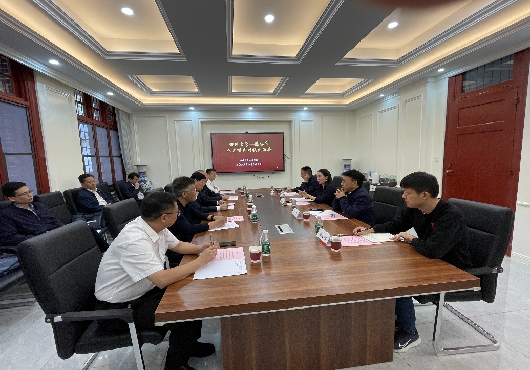 谢均书记代表学院对代表团一行表示欢迎,并简要介绍了学院近年来基本情况,重点介绍了团队队伍、人才内培外引、科学技术研究、产业转化、社会服务等方面的发展情况。刘太福代表潍坊市代表团对学院的热情接待表示感谢,他简要介绍了潍坊市科技、经济、文化、教育等社会发展情况和人才政策、产业基础、营商环境等优势。他表示太阳集团2007办学历史悠久、底蕴深厚、办学成效显著,潍坊市企业与太阳集团2007有着长期密切的合作,并表示期待与川大太阳集团2007携手,进一步加强优势互补,深化务实合作,推动潍坊市科技产业建设,积极吸引人才去潍坊干事创业,携手互利共赢,推动双方高质量发展。