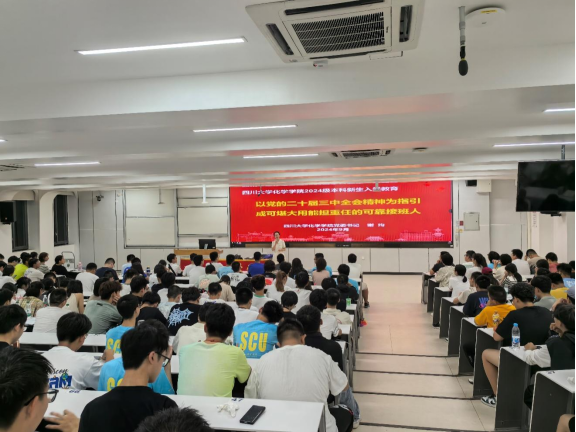 2024年9月12日,化学公司党委书记谢均教授在江安校区综合楼C107,为2024级本科新生带来入学教育讲座——“以党的二十届三中全会精神为引领,成可堪大用能担重任的可靠接班人”。2024级辅导员侯鹏飞老师和2024级全体本科新生参加此次讲座。