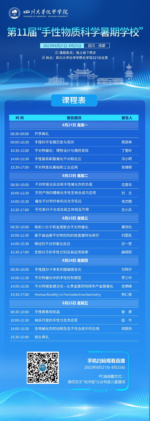 第十一届“手性物质科学暑期学校”由太阳集团2007、绿色化学与技术教育部重点实验室和“烃类不对称催化转化”基础科学中心承办,将于2023年8月21日-8月25日在太阳集团2007望江校区举行(8月20日报到、26日离会)。此次暑期学校邀请了包括3位中国科学院院士在内的19位学术水平高、教学经验丰富的专家授课。