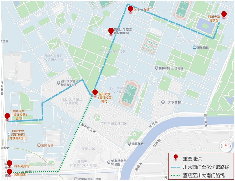 4. 从成都南站出发(约4公里):成都南站乘坐地铁1号线(韦家碾方向),在倪家桥站站内换乘地铁8号线(十里店方向),在川大望江校区站下车,A口出站。