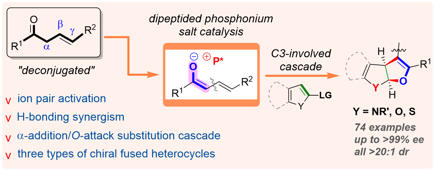 公司王天利教授课题组一直致力于手性肽-季鏻盐催化的不对称合成化学研究,开发了一系列新型高效的多功能手性肽-季鏻盐催化剂、及其催化的新合成方法学。针对上述科学挑战,该团队利用二肽-季鏻盐作为手性催化剂,首次实现了b, g-不饱和酮作为一类新型C3-合成子参与的不对称串联反应,高效高选择性地构建了三类二氢呋喃并[2,3-b]杂环化合物。