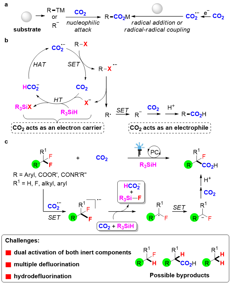 二氧化碳(CO2)是一种安全无毒、储量丰富的温室气体,也是一种理想的C1合成子,利用其制备结构多样的羧酸化合物具有重要意义。在过去几十年中,化学家们基于CO2双电子活化模式,利用有机金属试剂或碳负离子中间体对CO2进行亲核进攻,发展了多种高效制备羧酸化合物的方法。除此之外,化学家们近些年来发现通过单电子活化模式能够将CO2直接还原为CO2自由基阴离子,其具有高反应活性,经过自由基加成或自由基自由基偶联的方式能够实现具有独特选择性的新型反应。在上述两种反应路径中,CO2分别发挥亲电试剂与电子受体的单一作用。而在同一反应中,CO2同时发挥多重作用的研究还很少。