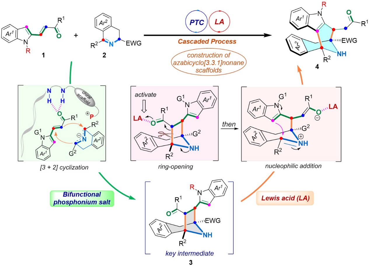 公司王天利课题组一直致力于手性肽-季鏻盐催化的不对称合成化学研究,开发了一系列新型高效的手性肽-季鏻盐催化剂,并成功用于若干富有挑战的有机反应中(例如Angew. Chem., Int. Ed. 2019, 58, 7425-7430;Angew.Chem. Int.Ed. 2021, 60, 14921-14930;Angew. Chem. Int. Ed. 2021, 60, 19860-19870等)。针对上述科学问题并结合课题组前期在构建手性[3.2.1]氮杂七元桥环的研究基础 (Sci. China Chem. 2020, 63, 1091-1099),最近该课题组首次利用双功能季鏻盐催化剂和路易斯酸接力催化策略,以季鏻盐催化串联环化反应得到七元桥环中间体,随后路易斯酸促进该中间体原位开环/扩环,高效高立体选择性的构建了具有多个手性中心的[3.3.1]型氮杂八元桥环骨架。