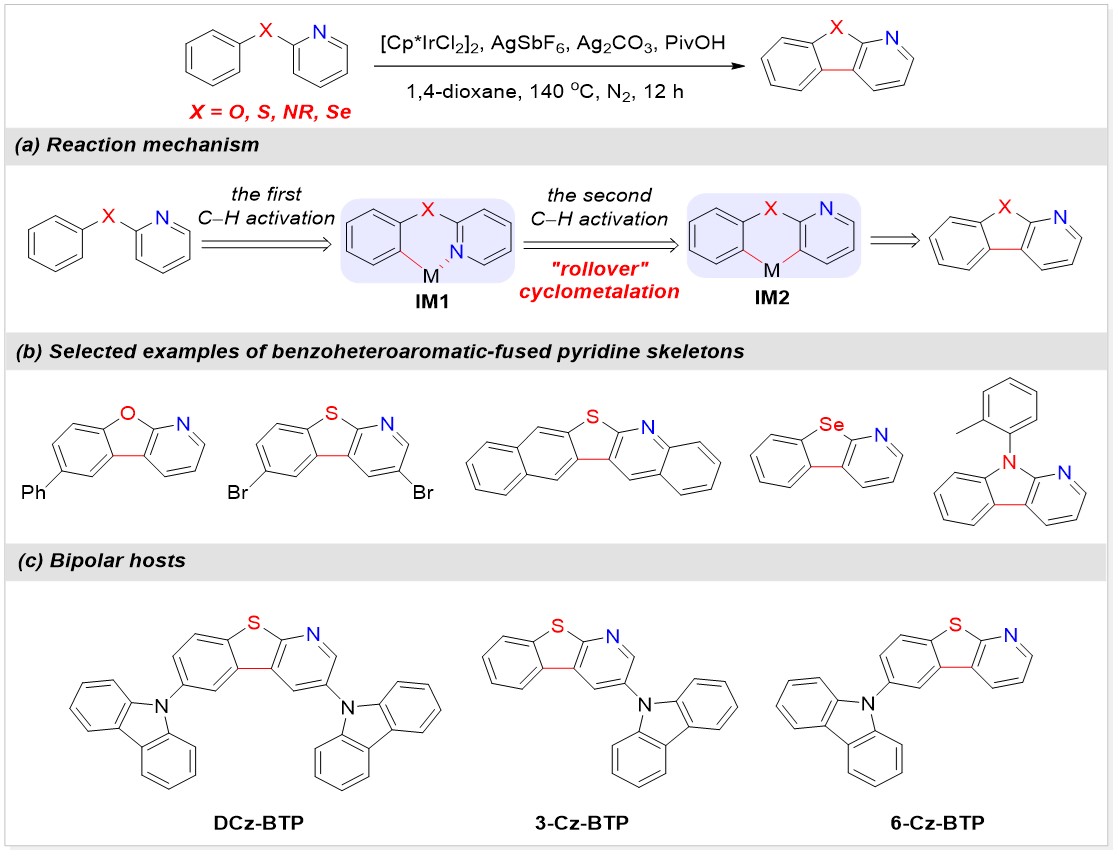 太阳集团2007游劲松教授、宾正杨副研究员团队致力于利用C−H活化策略构筑非传统结构的OLED新材料,以突破OLED材料结构和性能瓶颈。近期,游劲松教授和宾正杨副研究员等基于“翻转环金属化”策略发展了一种铱催化的分子内氧化C−H/C−H偶联反应,高效构筑了吡啶并杂芳环类分子骨架,为蓝光OLED主体材料的开发提供了丰富的分子库。作为一个例子,作者开发了一系列基于吡啶并苯并噻吩结构的双极性主体材料(DCz-BTP,3-Cz-BTP和6-Cz-BTP),其中吡啶环的引入有利于形成强的分子间氢键相互作用,从而显著改善主体材料的传输性能,进而降低器件驱动电压,提高器件效率。
