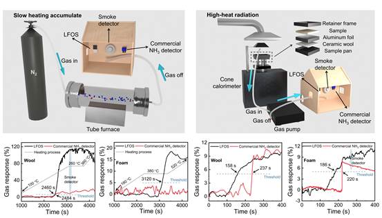 团队利用二维材料Ti3C2Tx MXene与MoS2构筑肖特基异质结,设计制备了具有超快响应速度(3 s @100 ppm),低检测限(最低检测浓度200 ppb),高灵敏度(81.7% @100 ppm和10.2% @200 ppb)的高性能氨气传感材料,并构建火灾探测器件(latent-fire-detecting olfactory system, LFOS);进一步以自制的潜伏期火灾模拟装置,构建缓慢升温分解和暴露于高热辐射分解的潜伏期火灾场景(图3),研究LFOS对典型可燃材料(羊毛与泡沫,常用于纺织品和建筑内墙)的响应性能。相较于商用氨气探测器和烟雾探测器,LFOS能快速的检测到火灾的威胁,实现了潜伏期火灾预警。