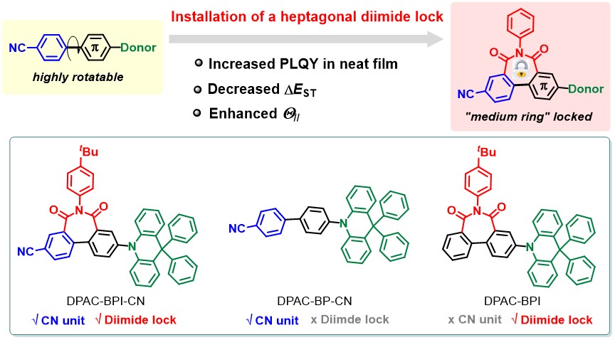 为解决这一问题,设计具有刚性结构的高效TADF分子,一些分子内锁定策略应运而生,例如引入吡啶基团形成分子内氢键相互作用,增大分子内位阻限制基团转动或者引入sp3原子锁等策略。上述策略大多数在掺杂OLED中得到了较好的应用,为规避主客体掺杂带来的系列问题(制作工艺复杂、成本高等),发展新颖的分子内锁定策略对构筑刚性、高效的TADF发光分子用于制备高性能非掺杂OLED对于其进一步发展和应用具有重要意义。