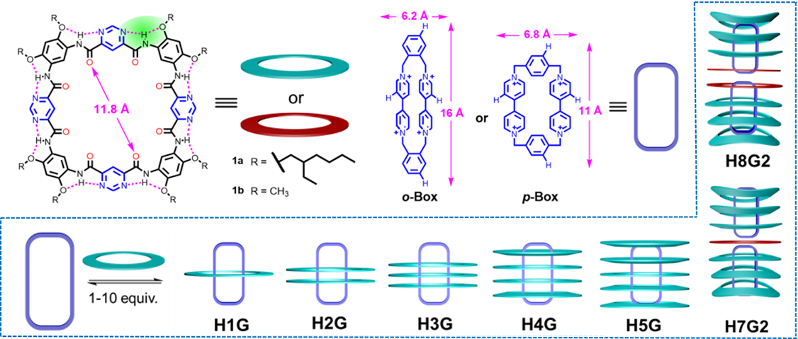 近日,公司袁立华教授课题组与杨成教授、深圳大学化学与环境工程学院李霄鹏教授合作, 利用含有嘧啶结构单元的氢键芳酰胺大环1a与阳离子环番客体(o-Box/p-Box)成功构筑了一类结构新颖的环套环组装体H4G和H5G及其高阶离散型二聚体H7G2和H8G2。在对环套环主客体复合物的单晶进行解析时,作者发现大环1a骨架发生了一系列连续变化的构象适应特征。此外,阳离子环番客体(p-Box)在H5G中客体表现为与H4G中不同的构象,表明在环套环主客体复合物中,客体也具有一定的构象适应性。环套环体系的构象适应性与整个超分子结构的稳定化有关,而后者取决于体系中多重非共价作用的协同结果。根据此现象,通过控制大环的当量,该团队成功构筑了由七个或八个大环1a与两个o-Box/p-Box组成的高阶复合物,即H7G2和H8G2。在离散型环套环二聚体晶体结构中,多个大环通过调整自身构象以使分子间相互作用力达到最大,以确保H7G2/H8G2型二聚复合物的形成,有效避免了超分子聚合物的形成。这与H4G/H5G中观察到o-Box呈现的两种不同构象相互呼应,表明环套环体系中的构象适应性可以由主、客体双方互相诱导而产生。该研究结果展现出二维氢键大环用于构筑高阶环套环组装体所具有的独特性,有助于理解高阶纳米组装体形成过程中涉及到的界面作用及构象适应性现象。