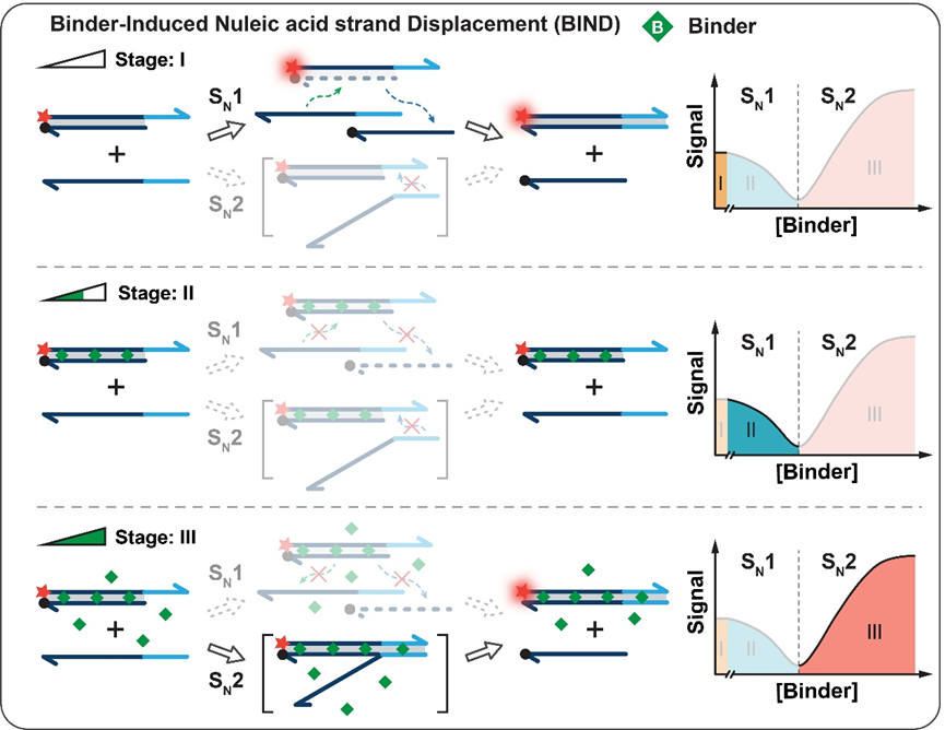 近日,公司李峰教授课题组以有机反应中亲核取代反应机理的视角,对该经典反应进行审视与重构:经典TMSD反应类似于SN2反应机理,而当环境中缺少金属阳离子时,链置换过程可与SN1路径类比。在此基础上,通过能够与DNA结合的小分子来代金属阳离子去实现链置换过程,并精准调节SN1和SN2反应路径。此类小分子通过插入或沟槽结合的方式与DNA的双螺旋结构结合,能够显著改变DNA的稳定性和功能,而且小分子与双链DNA(dsDNA)之间的相互作用是许多抗癌和抗感染药物的基础。本文中,首先验证了通过此类能够与DNA结合的小分子去介导链置换反应(Binder-Induced Nucleic acid strand Displacement, BIND)。结果显示,小分子与dsDNA的亲和力和其所带电荷能够精准控制链置换反应的路径。随后,进一步将这一全新链置换反应应用于DNA-小分子相互作用的系统、高通量表征,实现了结合常数(Kd)、结合位点大小(n)、协同性(ω)、焓(ΔH)和熵(−TΔS)的贡献以及序列选择性一系列特征参数的一站式综合分析。BIND还可以被设计成高通量筛选的工具,从大量化合物中筛选与DNA有特异性亲和作用的小分子化学物,并成功地从含有700个化合物的库中筛选出8个全新的DNA结合小分子。