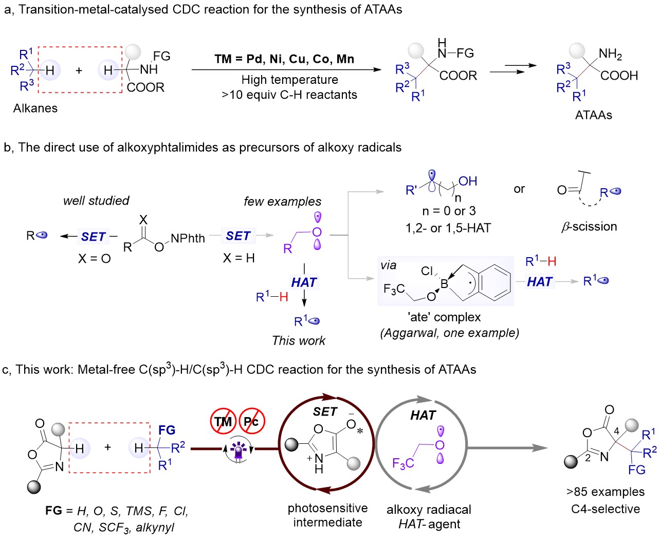 α-季碳氨基酸(ATAAs)衍生物广泛应用于医药以及材料科学等领域,它的合成受到了有机化学家及药物化学家的广泛关注。利用酶催化,过渡金属催化和自由基策略方法合成ATAAs是目前常见的方法,由于多数自由基前体从C-H原料合成而来,并且价格昂贵, 因此,利用廉价商业可得的原料通过C(sp3)–H/C(sp3)–H交叉脱氢偶联(CDC)反应,是构建ATAAs最便捷高效的方法。然而,这些策略普遍需要氨基酸前体中安装导向基团,使用金属催化剂或氧化剂,需要溶剂量的C-H原料,多数反应条件苛刻。因此,开发一种温和且通用的策略,以丰富的烷烃原料作为C-H原料,通过在温和条件下光诱导的CDC偶联反应来获得不同的ATAAs衍生物,是一个极具挑战性的课题。