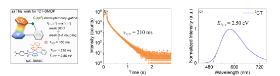 为了解决这一问题,近日,卢志云教授团队提出了一种用于获取长寿命3CT型SMUOP材料的新方法——采用sp3-C连接电子给体(D)和电子受体(A),构建出具有“面包夹”型结构的D-CH2(sp3)-A化合物。这类化合物的D、A单元间仅能发生较弱的电子耦合,而无法借助共轭桥获得高效的经键电子耦合,从而能赋予其3CT态的磷光辐射跃迁过程以更强的禁阻属性。基于该策略构建的化合物NIC-DMAC,即便是在刚性不算高的聚甲基丙烯酸甲酯(PMMA)基质中,也能实现寿命长达0.21 s的3CT态,同时其3CT能级亦可高达2.5 eV。