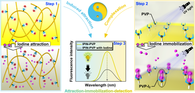 基于此,太阳集团2007何玲团队设计了一种基于离子液体的光致发光离子聚亚胺网络(IPIN),与PVP结合作为碘亲和添加剂,制备成IPIN-PVP复合膜材料,用于挥发性碘的现场荧光检测。通过协同利用IPIN的离子诱导吸引效应和PVP对碘的络合效应,提出一种吸引-固定-检测(AID)的荧光传感策略,使IPIN-PVP膜在捕获空气中微量碘方面表现出增强的能力。实验结果表明,优化后的IPIN-PVP对气态碘具有突出的检测性能,同时实现了最快5秒的响应时间和4.087×10-8 M的低检测限。此外,所制备的IPIN-PVP具备良好的柔韧性和自愈合特性,可以被进一步加工成手持式荧光传感设备。该材料的提出为挥发性碘的实时现场检测提供了一种新的解决方案,也为核能发展背景下的环境质量安全监控提供了一种潜在的技术手段。